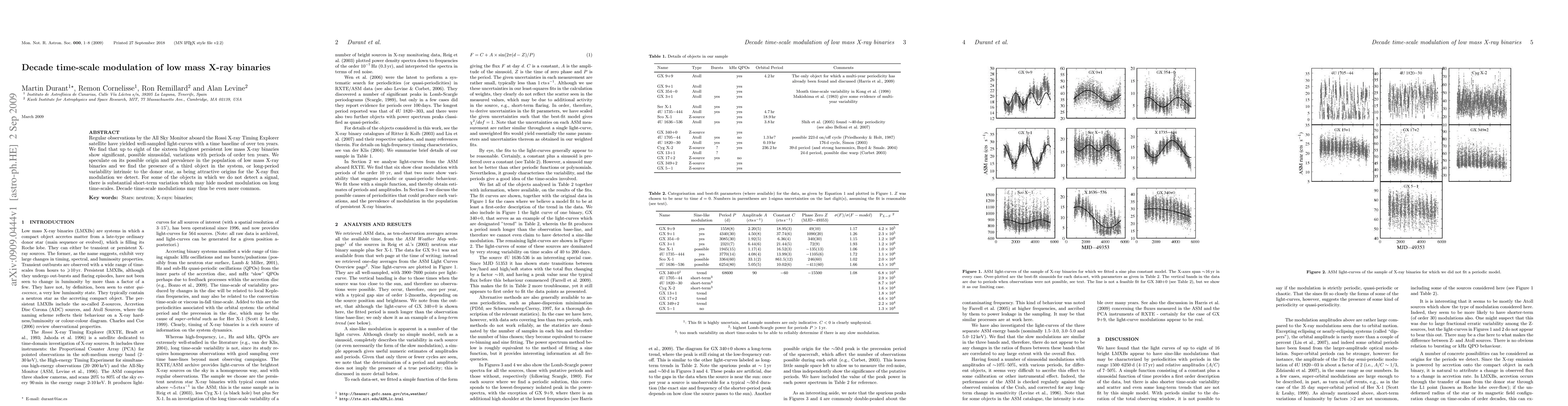 Regular observations by the All Sky Monitor aboard the Rossi X-ray Timing Explorer satellite have yielded well-sampled light-curves with a time baseline of over ten years. We find that up to eight of the sixteen brightest persistent low mass X-ray binaries show significant, possible sinusoidal, variations with periods of order ten years. We speculate on its possible origin and prevalence in the population of low mass X-ray binaries and we find the presence of a third object in the system, or long-period variability intrinsic to the donor star, as being attractive origins for the X-ray flux modulation we detect. For some of the objects in which we do not detect a signal, there is substantial short-term variation which may hide modest modulation on long time-scales. Decade time-scale modulations may thus be even more common.
