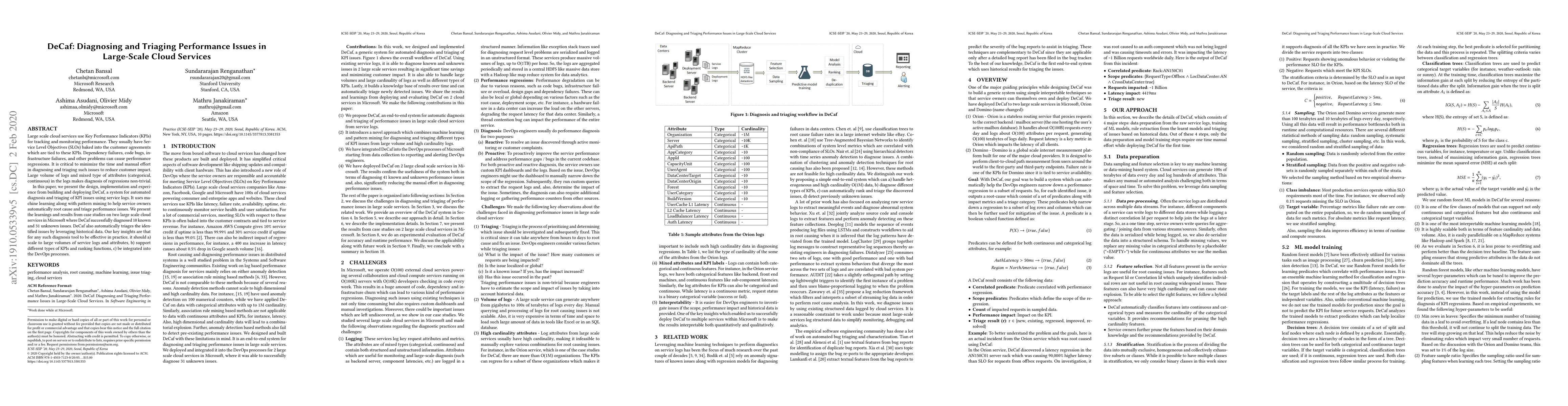 DeCaf is a system designed for automated diagnosis and triaging of performance issues in large-scale cloud services using service logs. It leverages machine learning and pattern mining to root cause and prioritize issues, successfully diagnosing 41 issues in two Microsoft cloud services. For practical effectiveness, it must scale to large log volumes, support diverse KPIs, and integrate into DevOps processes.