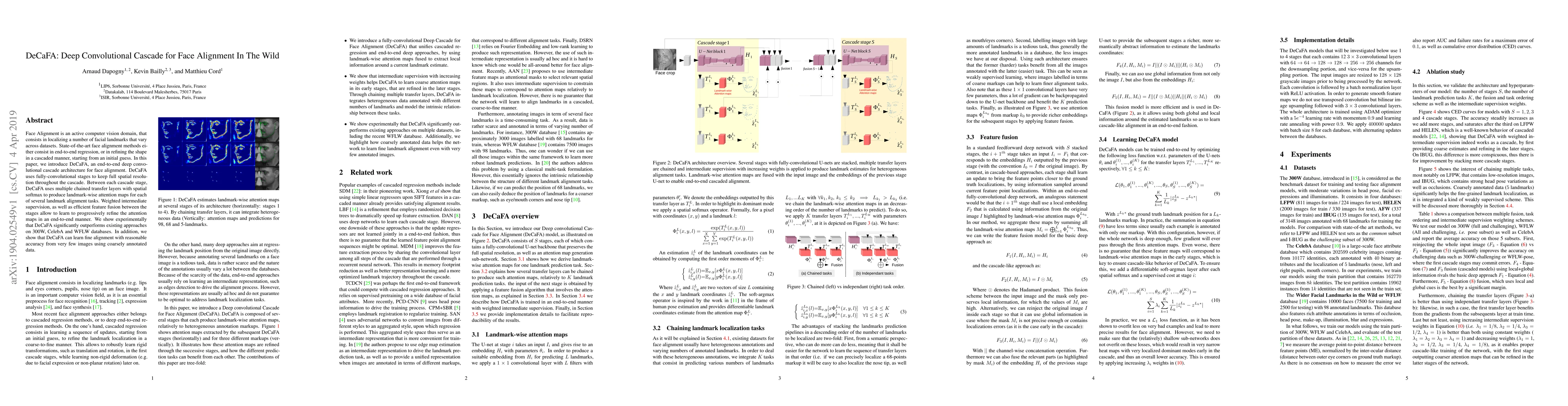 DeCaFA is a deep convolutional cascade architecture for face alignment that progressively refines attention maps through fully-convolutional stages and transfer layers. It outperforms existing methods on multiple datasets and can achieve fine alignment with limited annotated data.