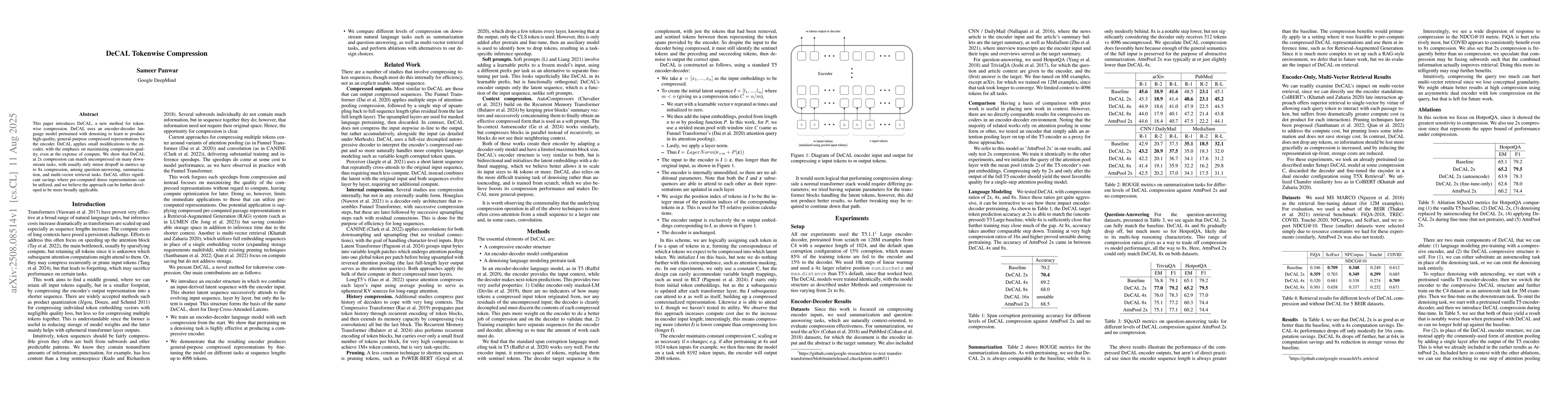 This paper introduces DeCAL, a new method for tokenwise compression. DeCAL uses an encoder-decoder language model pretrained with denoising to learn to produce high-quality, general-purpose compressed representations by the encoder. DeCAL applies small modifications to the encoder, with the emphasis on maximizing compression quality, even at the expense of compute. We show that DeCAL at 2x compression can match uncompressed on many downstream tasks, with usually only minor dropoff in metrics up to 8x compression, among question-answering, summarization, and multi-vector retrieval tasks. DeCAL offers significant savings where pre-computed dense representations can be utilized, and we believe the approach can be further developed to be more broadly applicable.
