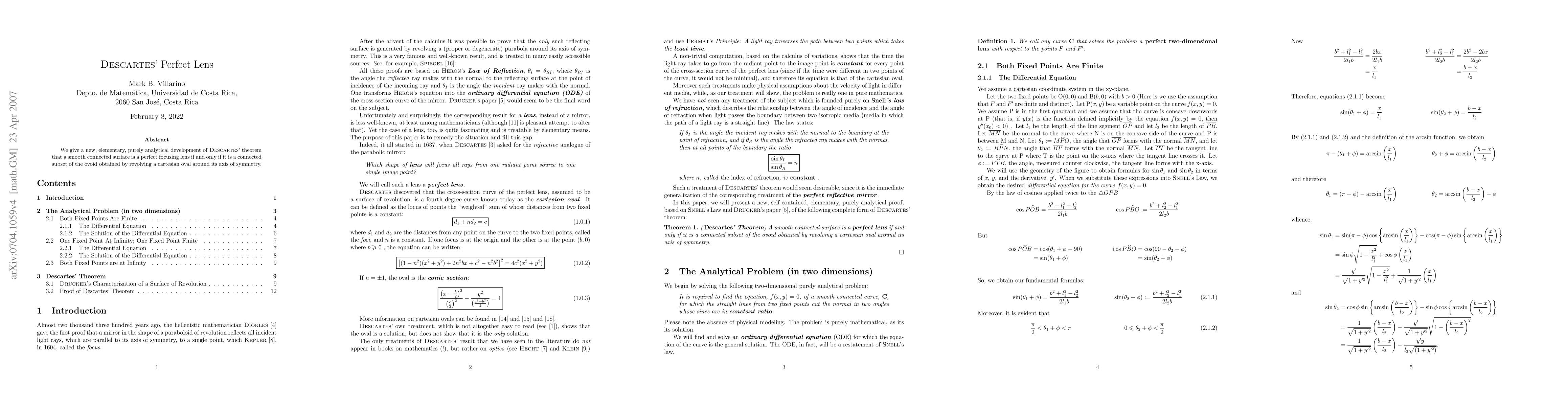 We give a new, elementary, purely analytical development of \textsc{Descartes}' theorem that a smooth connected surface is a perfect focusing lens if and only if it is a connected subset of the ovoid obtained by revolving a cartesian oval around its axis of symmetry.