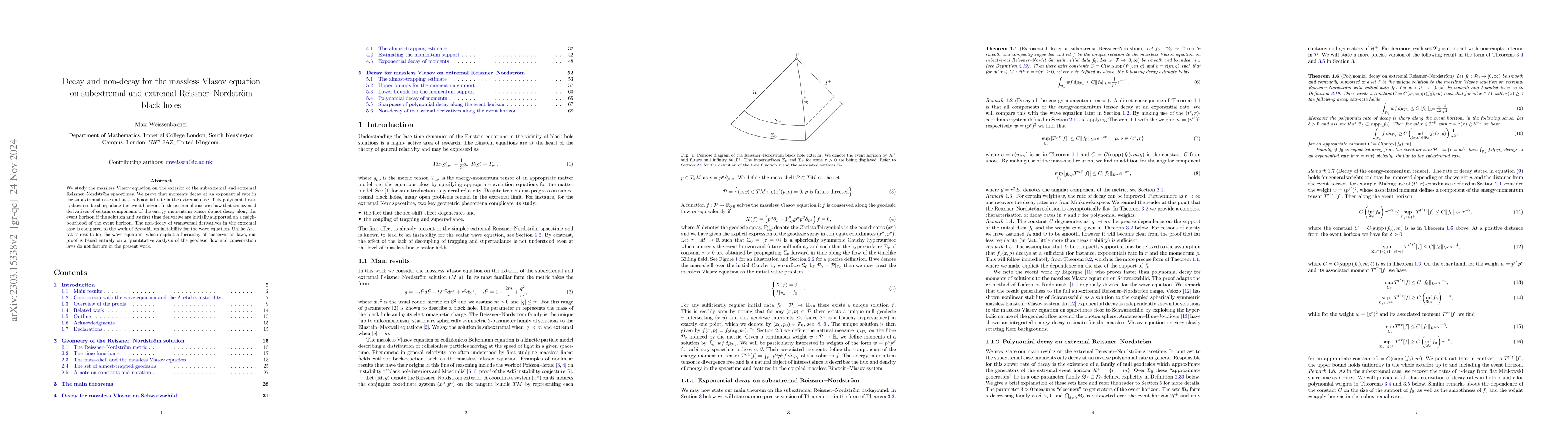 We study the massless Vlasov equation on the exterior of the subextremal and extremal Reissner-Nordstr\"om spacetimes. We prove that moments decay at an exponential rate in the subextremal case and at a polynomial rate in the extremal case. This polynomial rate is shown to be sharp along the event horizon. In the extremal case we show that transversal derivatives of certain components of the energy momentum tensor do not decay along the event horizon if the solution and its first time derivative are initially supported on a neighbourhood of the event horizon. The non-decay of transversal derivatives in the extremal case is compared to the work of Aretakis on instability for the wave equation. Unlike Aretakis' results for the wave equation, which exploit a hierarchy of conservation laws, our proof is based entirely on a quantitative analysis of the geodesic flow and conservation laws do not feature in the present work.