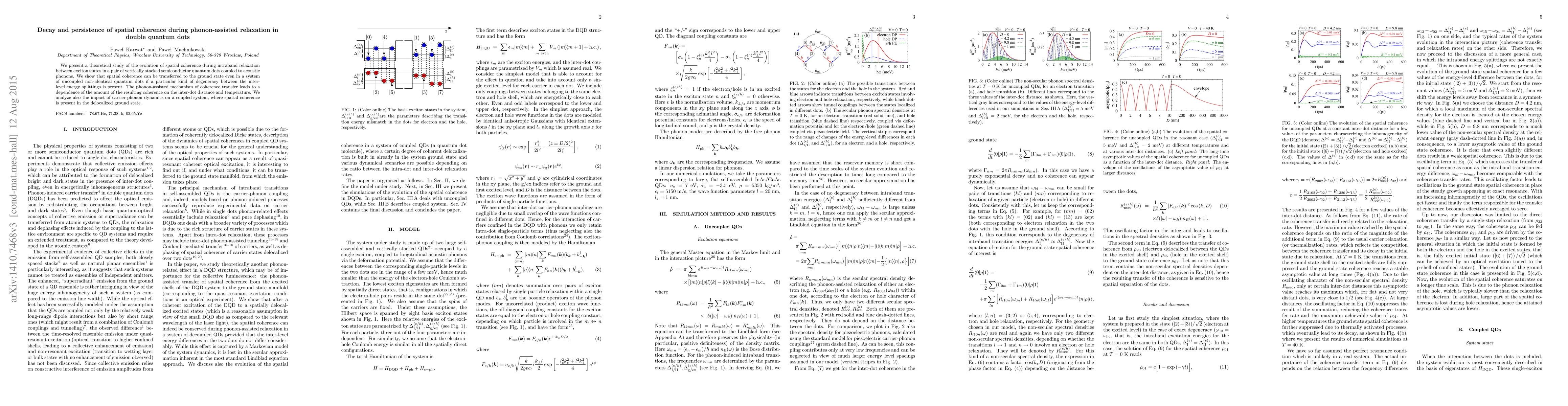 Researchers studied how spatial coherence in quantum dots is affected by phonon-assisted relaxation, finding that coherence can be transferred to the ground state under certain conditions. This phenomenon depends on inter-dot distance and temperature.