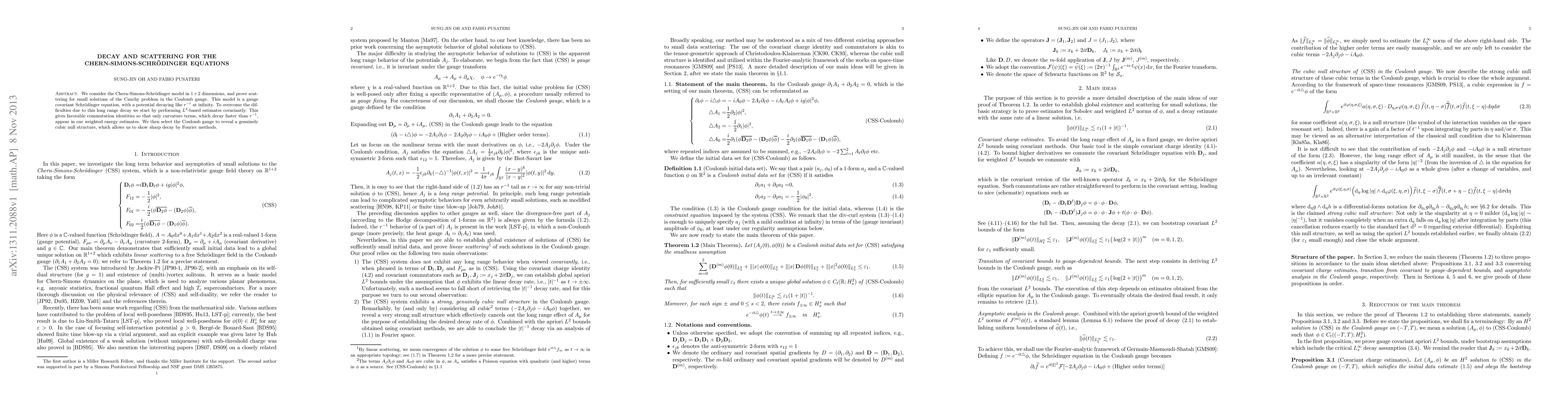We consider the Chern-Simons-Schr\"odinger model in 1+2 dimensions, and prove scattering for small solutions of the Cauchy problem in the Coulomb gauge. This model is a gauge covariant Schr\"odinger equation, with a potential decaying like $r^{-1}$ at infinity. To overcome the difficulties due to this long range decay we start by performing $L^2$-based estimates covariantly. This gives favorable commutation identities so that only curvature terms, which decay faster than $r^{-1}$, appear in our weighted energy estimates. We then select the Coulomb gauge to reveal a genuinely cubic null structure, which allows us to show sharp decay by Fourier methods.
