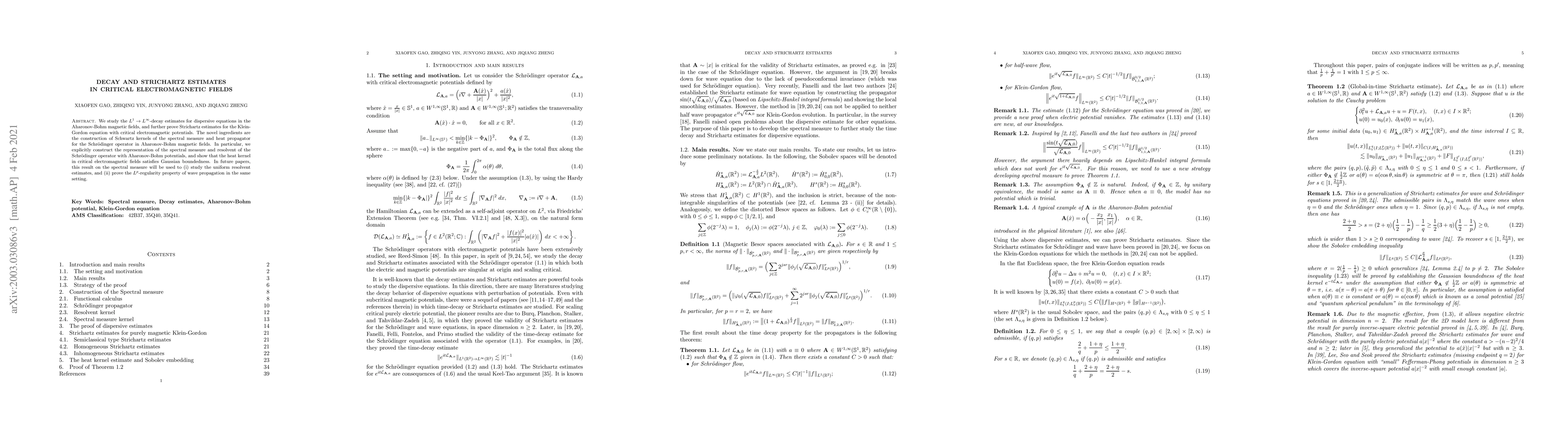 We study the $L^1\to L^\infty$-decay estimates for dispersive equations in the Aharonov-Bohm magnetic fields, and further prove Strichartz estimates for the Klein-Gordon equation with critical electromagnetic potentials. The novel ingredients are the construction of Schwartz kernels of the spectral measure and heat propagator for the Schr\"odinger operator in Aharonov-Bohm magnetic fields. In particular, we explicitly construct the representation of the spectral measure and resolvent of the Schr\"odinger operator with Aharonov-Bohm potentials, and show that the heat kernel in critical electromagnetic fields satisfies Gaussian boundedness. In future papers, this result on the spectral measure will be used to (i) study the uniform resolvent estimates, and (ii) prove the $L^p$-regularity property of wave propagation in the same setting.