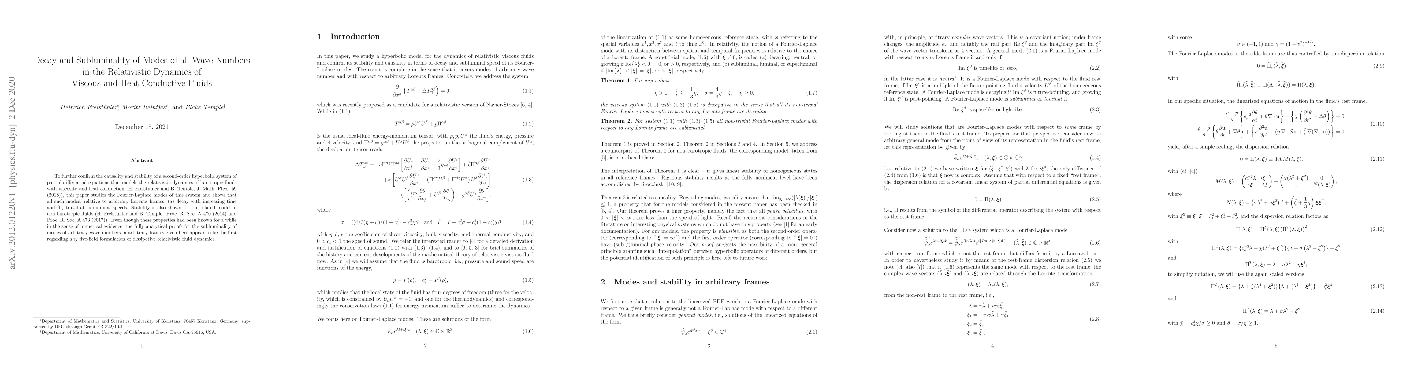 To further confirm the causality and stability of a second-order hyperbolic system of partial differential equations that models the relativistic dynamics of barotropic fluids with viscosity and heat conduction (H. Freist\"uhler and B. Temple, J. Math. Phys. 59 (2018)), this paper studies the Fourier-Laplace modes of this system and shows that all such modes, relative to arbitrary Lorentz frames, (a) decay with increasing time and (b) travel at subluminal speeds. Stability is also shown for the related model of non-barotropic fluids (H. Freist\"uhler and B. Temple. Proc. R. Soc. A 470 (2014) and Proc. R. Soc. A 473 (2017)). Even though these properties had been known for a while in the sense of numerical evidence, the fully analytical proofs for the subluminality of modes of arbitrary wave numbers in arbitrary frames given here appear to be the first regarding any five-field formulation of dissipative relativistic fluid dynamics.