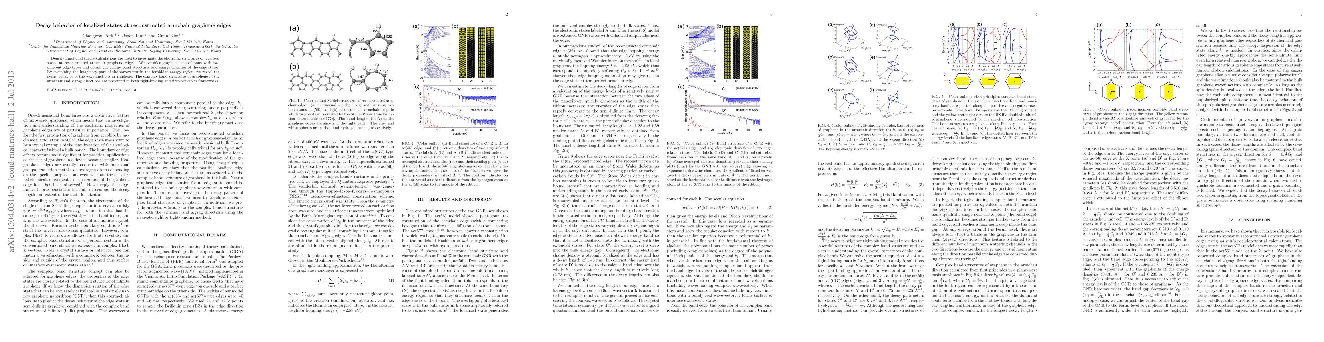 This study uses density functional theory to examine the electronic structures and decay behavior of localized states at reconstructed armchair graphene edges, revealing complex band structures and the wavefunctions' decay behavior in the forbidden energy region through tight-binding and first-principles frameworks.