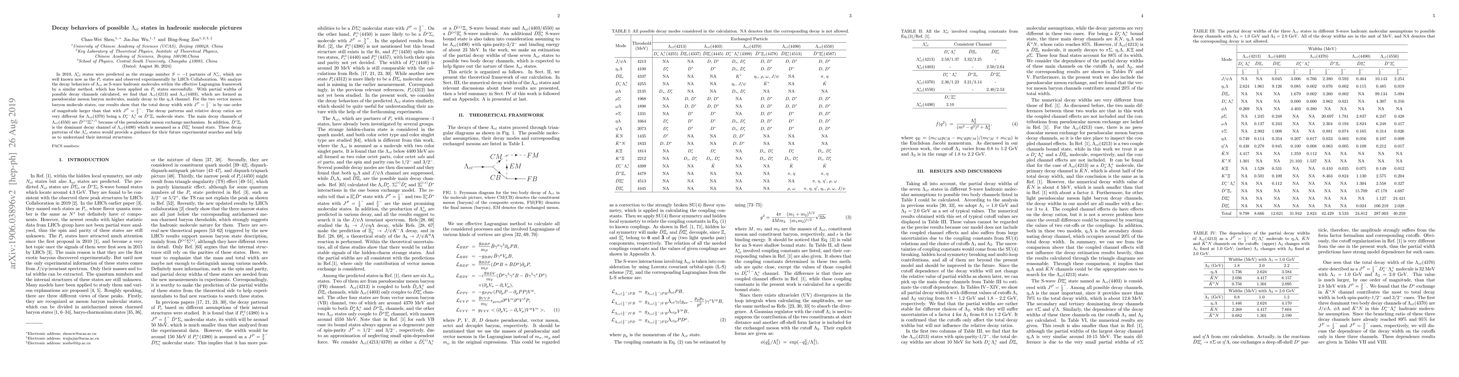 In 2010, $\Lambda^*_{c\bar{c}}$ states were predicted as the strange number $S=-1$ partners of $N^*_{c\bar{c}}$, which are well known now as the $P_c$ states and observed experimentally by LHCb Collaboration. We analyze the decay behaviors of $\Lambda_{c\bar{c}}$ as S-wave hadronic molecules within the effective Lagrangian framework by a similar method, which has been applied on $P_c$ states successfully. With partial widths of possible decay channels calculated, we find that $\Lambda_{c\bar{c}}(4213)$ and $\Lambda_{c\bar{c}}(4403)$, which are formed as pseudoscalar meson baryon molecules, mainly decay to the $\eta_c \Lambda$ channel. For the two vector meson baryon molecule states, our results show that the total decay width with $J^P=\frac12^-$ is by one order of magnitude larger than that with $J^P=\frac32^-$. The decay patterns and relative decay ratios are very different for $\Lambda_{c\bar{c}}(4370)$ being a $D_s^{* -} \Lambda_c^+$ or $\bar{D}^{*} \Xi_c$ molecule state. The main decay channels of $\Lambda_{c\bar{c}}(4550)$ are $\bar{D}^{(*)} \Xi^{(*,\prime)}_c$ because of the pseudoscalar meson exchange mechanism. In addition, $\bar{D}^{*} \Xi_c$ is the dominant decay channel of $\Lambda_{c\bar{c}}(4490)$ which is assumed as a $\bar{D} \Xi_c^{*}$ bound state. These decay patterns of the $\Lambda^*_{c\bar{c}}$ states would provide a guidance for their future experimental searches and help us to understand their internal structures.