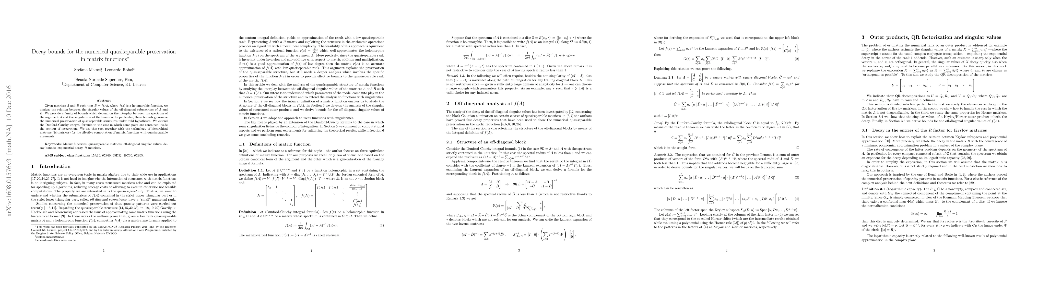 This paper establishes decay bounds for the numerical preservation of quasiseparable structures in matrix functions, analyzing the relationship between the singular values of off-diagonal submatrices of matrices transformed by holomorphic functions. The authors extend the Dunford-Cauchy integral formula and utilize hierarchical matrices to compute matrix functions effectively.