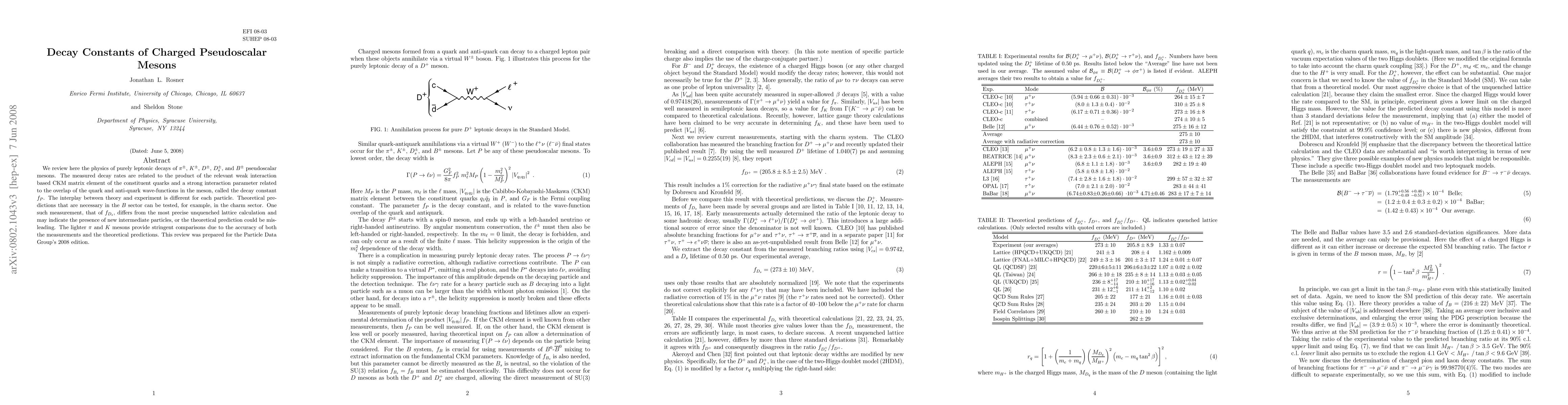 This review focuses on the decay constants of charged pseudoscalar mesons (pi-, K-, D+, Ds+, B-) crucial for understanding leptonic decays. The decay constants, linked to weak and strong interaction parameters, are compared between experimental measurements and theoretical predictions. Discrepancies, particularly with fDs, hint at potential new particles or flawed predictions, while pi and K mesons offer precise comparisons due to accurate measurements and predictions.