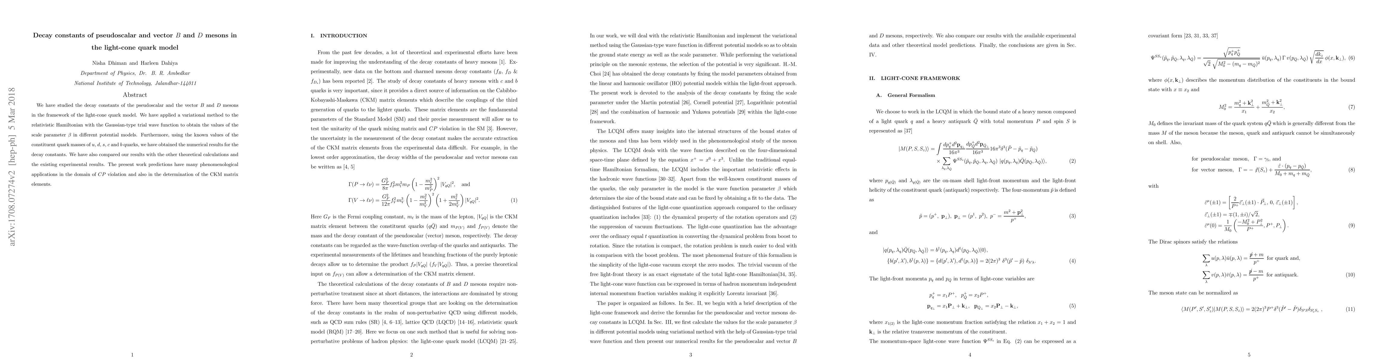 This paper investigates the decay constants of pseudoscalar and vector $B$ and $D$ mesons using the light-cone quark model and a variational method, comparing results with theoretical and experimental data for applications in $CP$ violation and CKM matrix elements. The study employs a relativistic Hamiltonian and Gaussian-type trial wave functions to determine the scale parameter $\beta$.