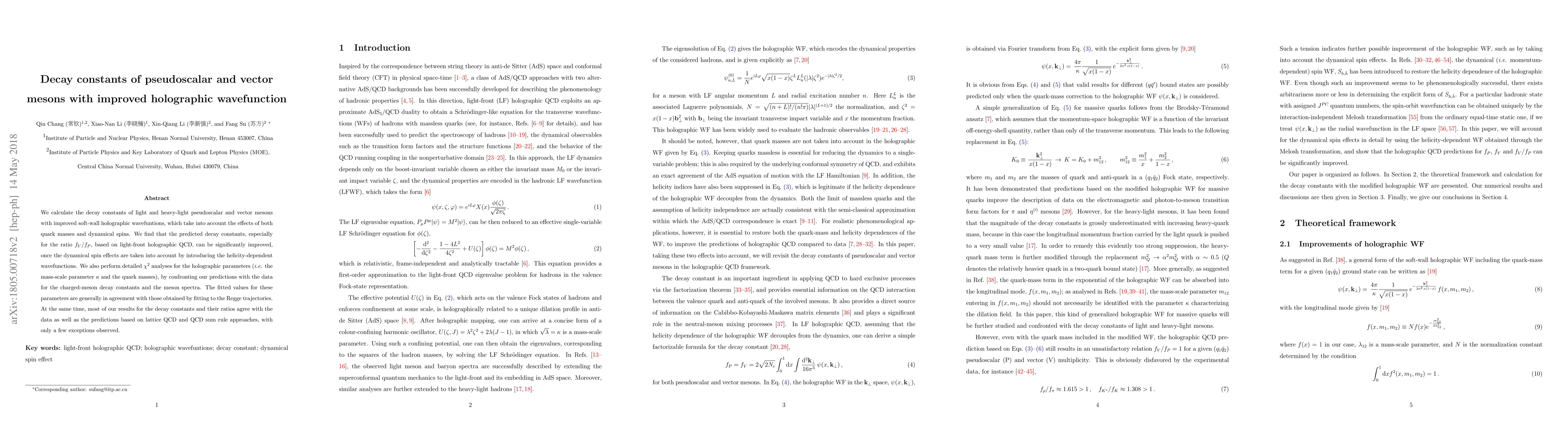 This paper calculates decay constants for pseudoscalar and vector mesons using improved holographic wavefunctions that consider quark masses and dynamical spins. The results show significant improvements in the ratio $f_V/f_P$ and are generally in agreement with experimental data and other theoretical predictions.