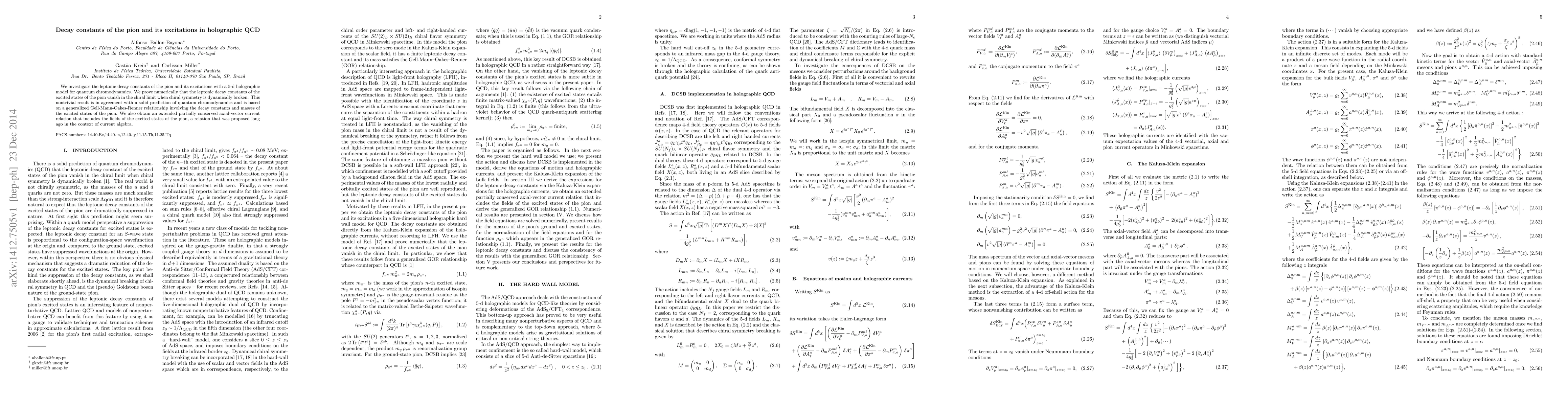 We investigate the leptonic decay constants of the pion and its excitations with a 5-d holographic model for quantum chromodynamics. We prove numerically that the leptonic decay constants of the excited states of the pion vanish in the chiral limit when chiral symmetry is dynamically broken. This nontrivial result is in agreement with a solid prediction of quantum chromodynamics and is based on a generalized Gell-Mann-Oakes-Renner relationship involving the decay constants and masses of the excited states of the pion. We also obtain an extended partially conserved axial-vector current relation that includes the fields of the excited states of the pion, a relation that was proposed long ago in the context of current algebra.