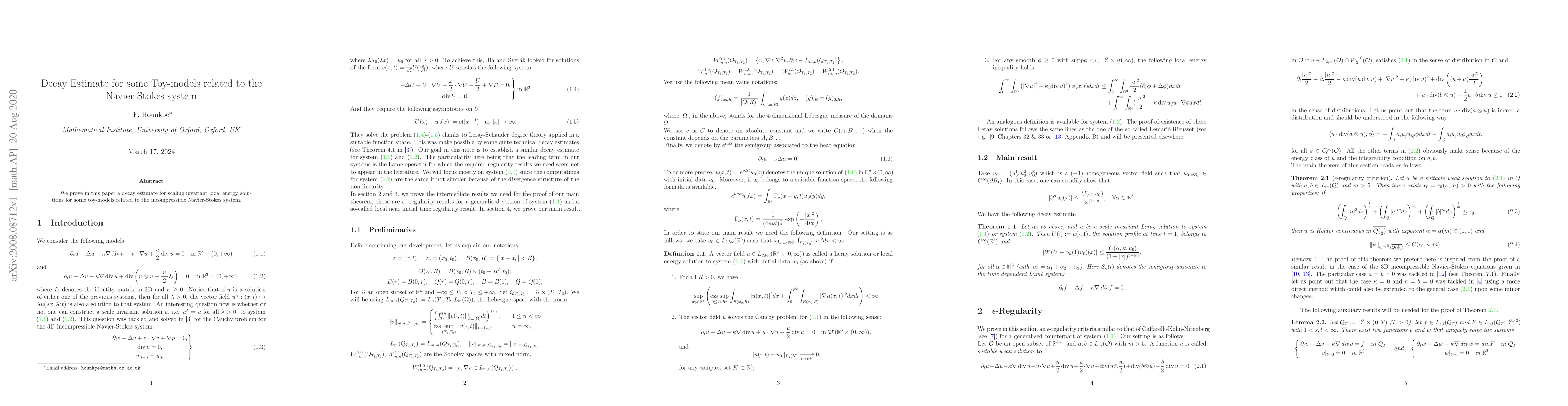 Summary: The paper establishes a decay estimate for scaling invariant local energy solutions in simplified models connected to the incompressible Navier-Stokes system, contributing to the understanding of the behavior of such solutions.