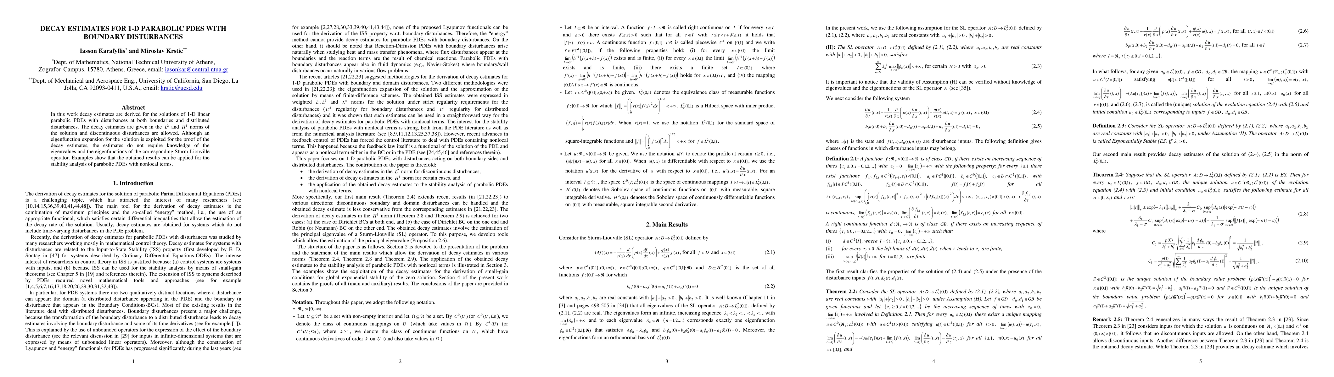 In this work decay estimates are derived for the solutions of 1-D linear parabolic PDEs with disturbances at both boundaries and distributed disturbances. The decay estimates are given in the L2 and H1 norms of the solution and discontinuous disturbances are allowed. Although an eigenfunction expansion for the solution is exploited for the proof of the decay estimates, the estimates do not require knowledge of the eigenvalues and the eigenfunctions of the corresponding Sturm-Liouville operator. Examples show that the obtained results can be applied for the stability analysis of parabolic PDEs with nonlocal terms.