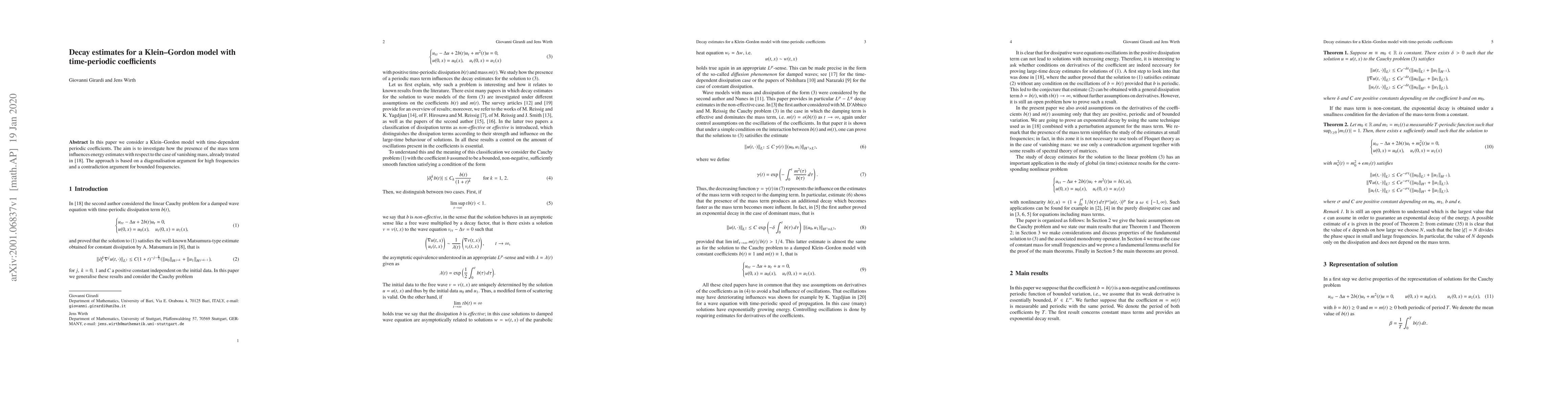 In this paper we consider a Klein-Gordon model with time-dependent periodic coefficients. The aim is to investigate how the presence of the mass term influences energy estimates with respect to the case of vanishing mass, already treated in [18]. The approach is based on a diagonalisation argument for high frequencies and a contradiction argument for bounded frequencies.