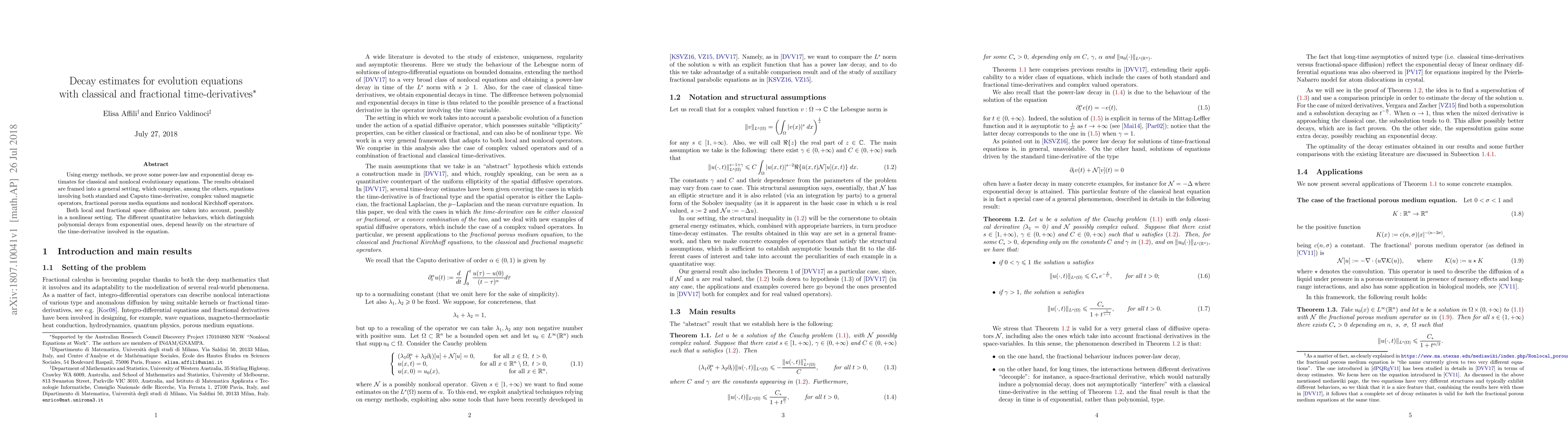 This paper uses energy methods to establish decay estimates for evolutionary equations with both classical and fractional time-derivatives, including equations with standard and Caputo derivatives, complex magnetic operators, and fractional porous media equations. The study differentiates between polynomial and exponential decay behaviors based on the time-derivative structure.