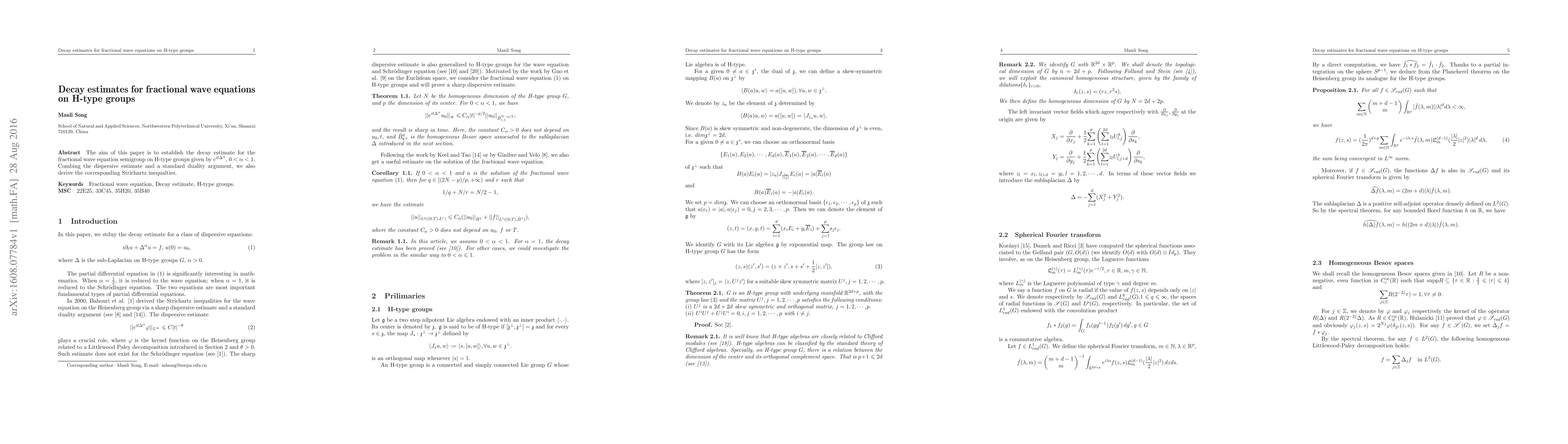 The aim of this paper is to establish the decay estimate for the fractional wave equation semigroup on H-type groups given by $e^{it\Delta^\alpha}$, $0<\alpha<1$. Combing the dispersive estimate and a standard duality argument, we also derive the corresponding Strichartz inequalties.
