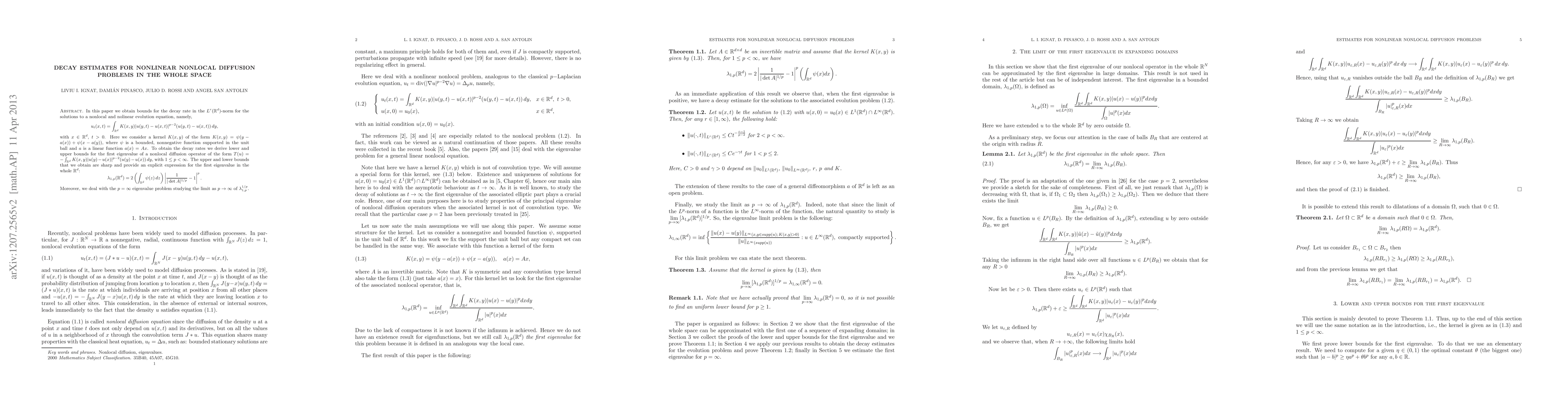 In this paper we obtain bounds for the decay rate in the $L^r (\rr^d)$-norm for the solutions to a nonlocal and nolinear evolution equation, namely, $$u_t(x,t) = \int_{\rr^d} K(x,y) |u(y,t)- u(x,t)|^{p-2} (u(y,t)- u(x,t)) \, dy, $$ with $ x \in \rr^d$, $ t>0$. Here we consider a kernel $K(x,y)$ of the form $K(x,y)=\psi (y-a(x))+\psi(x-a(y))$, where $\psi$ is a bounded, nonnegative function supported in the unit ball and $a$ is a linear function $a(x)= Ax$. To obtain the decay rates we derive lower and upper bounds for the first eigenvalue of a nonlocal diffusion operator of the form $ T(u) = - \int_{\rr^d} K(x,y) |u(y)-u(x)|^{p-2} (u(y)-u(x)) \, dy$, with $1 \leq p < \infty$. The upper and lower bounds that we obtain are sharp and provide an explicit expression for the first eigenvalue in the whole $\rr^d$: $$ \lambda_{1,p} (\rr^d) = 2(\int_{\rr^d} \psi (z) \, dz)|\frac{1}{|\det{A}|^{1/p}} -1|^p. $$ Moreover, we deal with the $p=\infty$ eigenvalue problem studying the limit as $p \to \infty$ of $\lambda_{1,p}^{1/p}$.