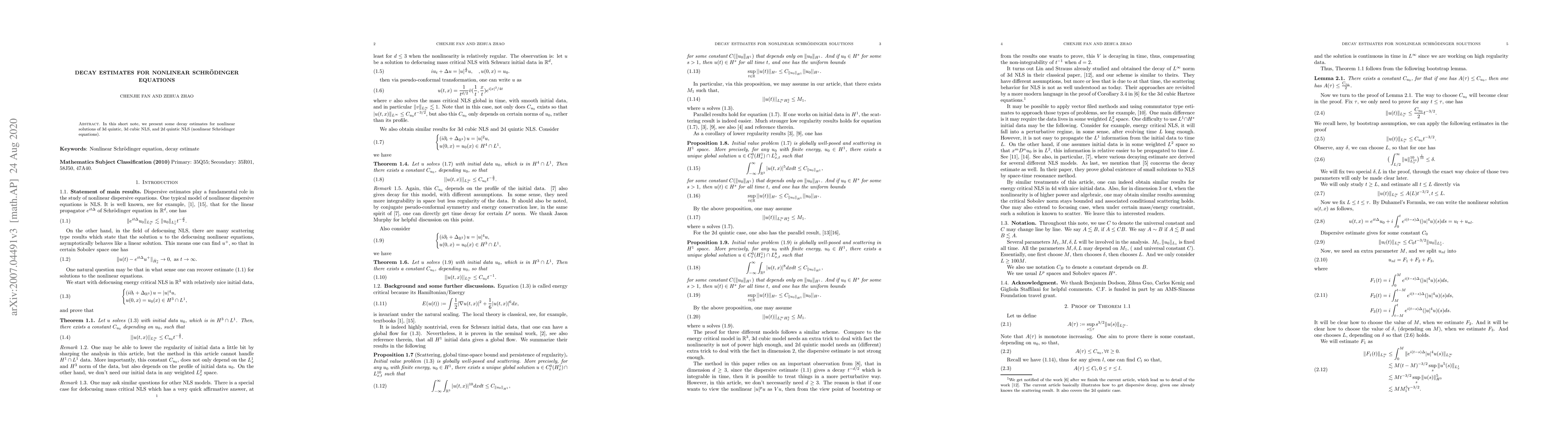 Summary: This paper provides decay estimates for nonlinear solutions of various forms of nonlinear Schrödinger equations, including 3d quintic, 3d cubic, and 2d quintic cases. The focus is on the behavior and rate of decay of these solutions.