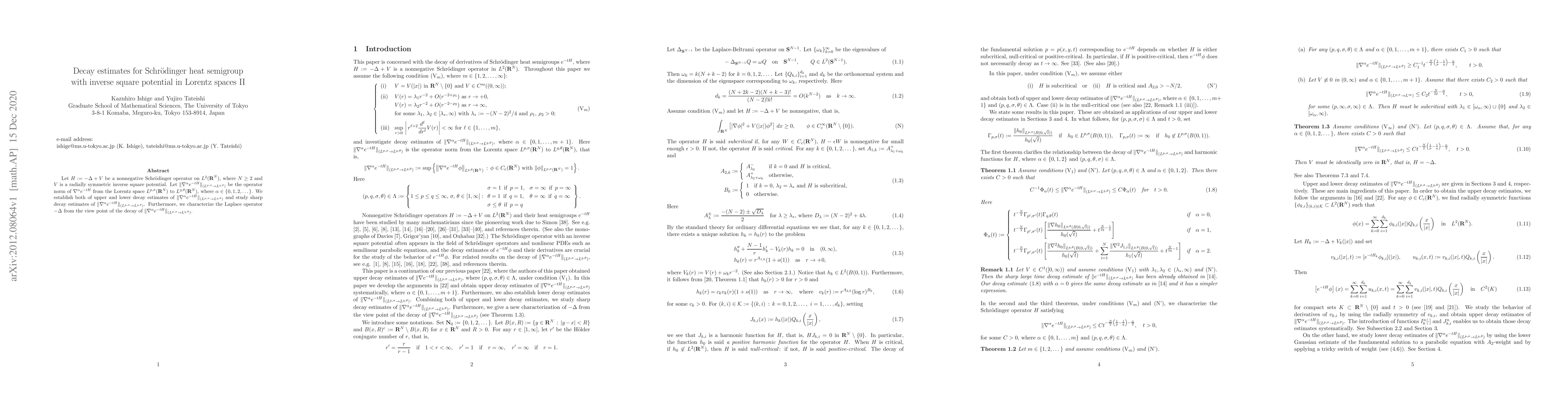 Let $H:=-\Delta+V$ be a nonnegative Schr\"odinger operator on $L^2({\bf R}^N)$, where $N\ge 2$ and $V$ is a radially symmetric inverse square potential. Let $\|\nabla^\alpha e^{-tH}\|_{(L^{p,\sigma}\to L^{q,\theta})}$ be the operator norm of $\nabla^\alpha e^{-tH}$ from the Lorentz space $L^{p,\sigma}({\bf R}^N)$ to $L^{q,\theta}({\bf R}^N)$, where $\alpha\in\{0,1,2,\dots\}$. We establish both of upper and lower decay estimates of $\|\nabla^\alpha e^{-tH}\|_{(L^{p,\sigma}\to L^{q,\theta})}$ and study sharp decay estimates of $\|\nabla^\alpha e^{-tH}\|_{(L^{p,\sigma}\to L^{q,\theta})}$. Furthermore, we characterize the Laplace operator $-\Delta$ from the view point of the decay of $\|\nabla^\alpha e^{-tH}\|_{(L^{p,\sigma}\to L^{q,\theta})}$.