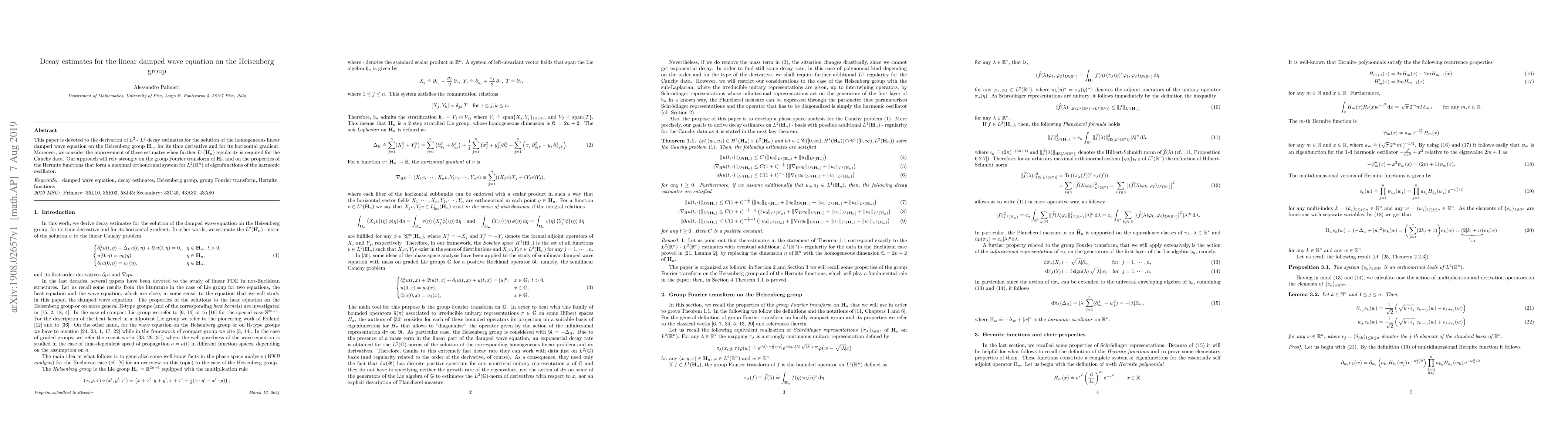 This paper is devoted to the derivation of $L^2$ - $L^2$ decay estimates for the solution of the homogeneous linear damped wave equation on the Heisenberg group $\mathbf{H}_n$, for its time derivative and for its horizontal gradient. Moreover, we consider the improvement of these estimates when further $L^1(\mathbf{H}_n)$ regularity is required for the Cauchy data. Our approach will rely strongly on the group Fourier transform of $\mathbf{H}_n$ and on the properties of the Hermite functions that form a maximal orthonormal system for $L^2(\mathbb{R}^n)$ of eigenfunctions of the harmonic oscillator.