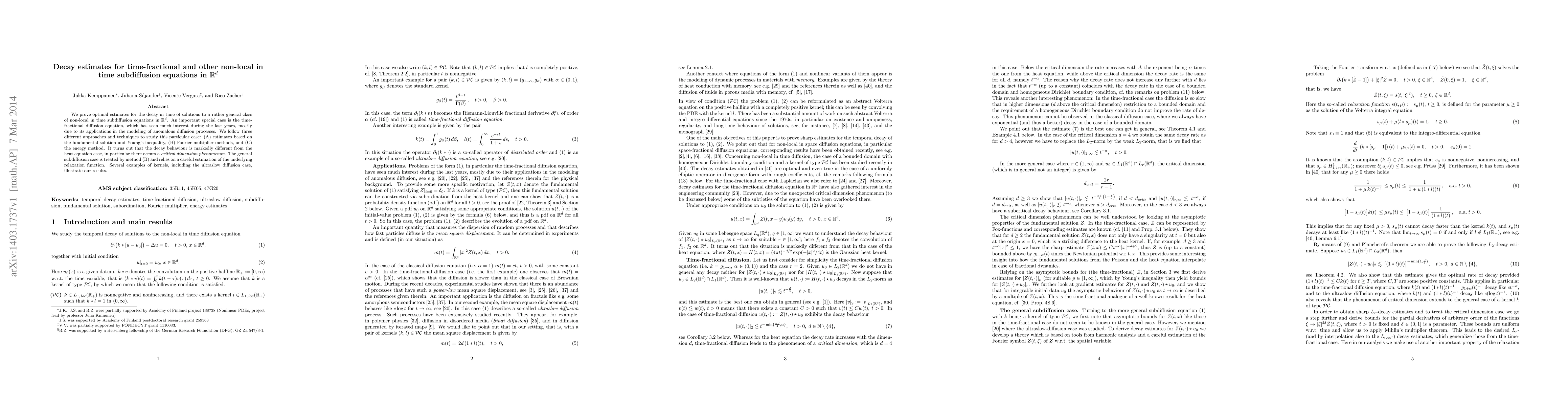 This paper provides optimal decay estimates for solutions to a broad class of non-local in time subdiffusion equations, focusing on the time-fractional diffusion equation. It employs three distinct methods to analyze the decay behavior, revealing a critical dimension phenomenon distinct from the classical heat equation.
