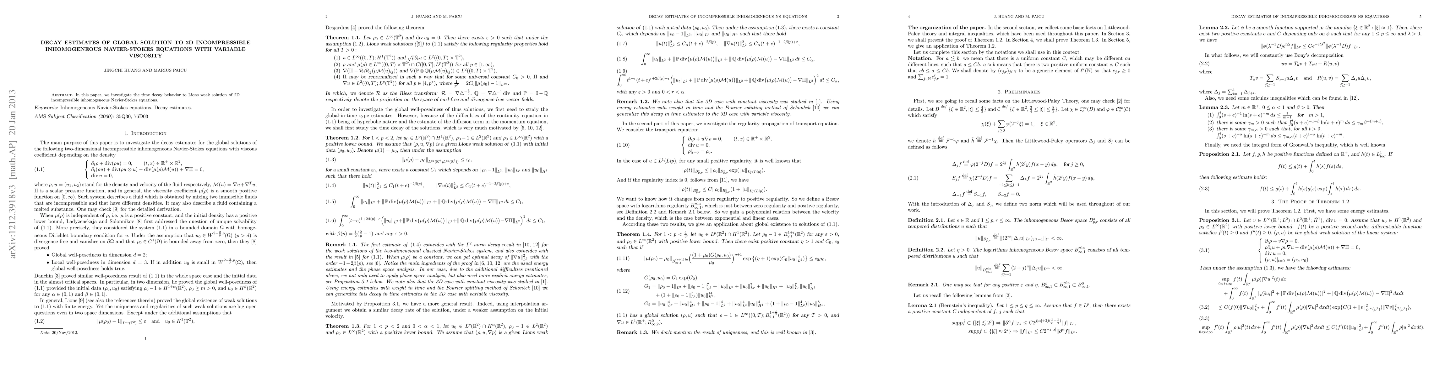 Summary: This paper examines the time decay characteristics of global solutions to 2D incompressible Navier-Stokes equations featuring density-dependent viscosity, focusing on the decay behavior of Lions weak solutions.