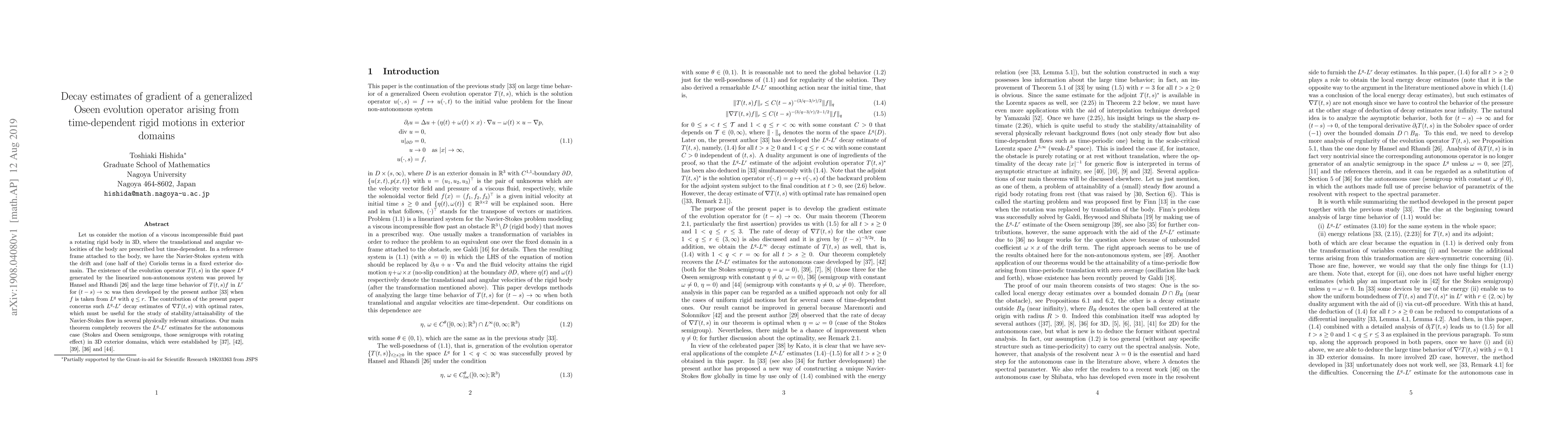 This paper investigates decay estimates of the gradient of a generalized Oseen evolution operator for time-dependent rigid motions in 3D exterior domains, establishing optimal $L^q$-$L^r$ decay rates. The results extend previous findings for the autonomous case and are crucial for studying stability in Navier-Stokes flows.