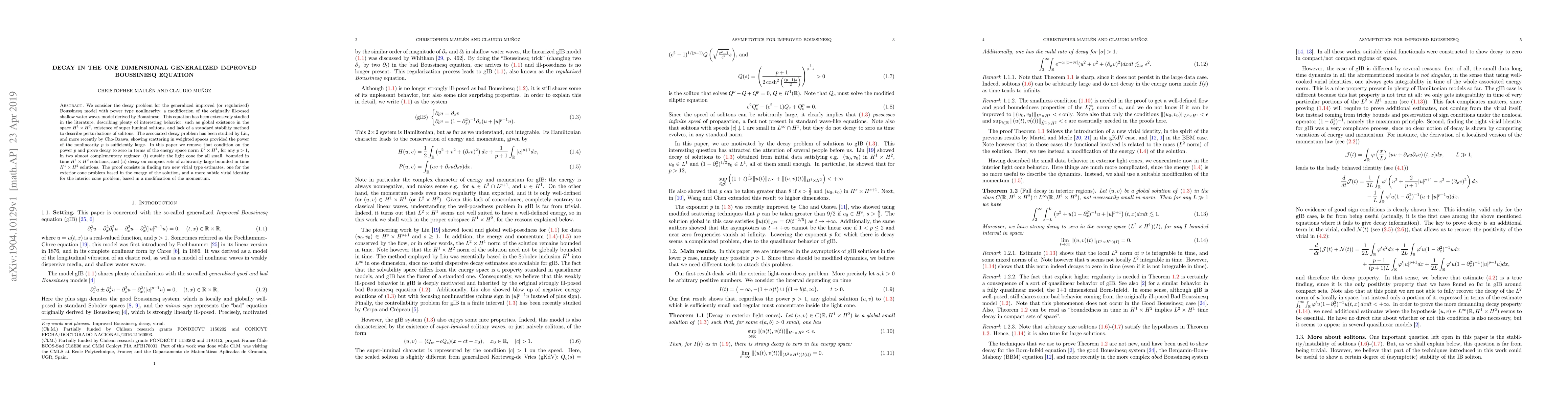 We consider the decay problem for the generalized improved (or regularized) Boussinesq model with power type nonlinearity, a modification of the originally ill-posed shallow water waves model derived by Boussinesq. This equation has been extensively studied in the literature, describing plenty of interesting behavior, such as global existence in the space $H^1\times H^2$, existence of super luminal solitons, and lack of a standard stability method to describe perturbations of solitons. The associated decay problem has been studied by Liu, and more recently by Cho-Ozawa, showing scattering in weighted spaces provided the power of the nonlinearity $p$ is sufficiently large. In this paper we remove that condition on the power $p$ and prove decay to zero in terms of the energy space norm $L^2\times H^1$, for any $p>1$, in two almost complementary regimes: (i) outside the light cone for all small, bounded in time $H^1\times H^2$ solutions, and (ii) decay on compact sets of arbitrarily large bounded in time $H^1\times H^2$ solutions. The proof consists in finding two new virial type estimates, one for the exterior cone problem based in the energy of the solution, and a more subtle virial identity for the interior cone problem, based in a modification of the momentum.