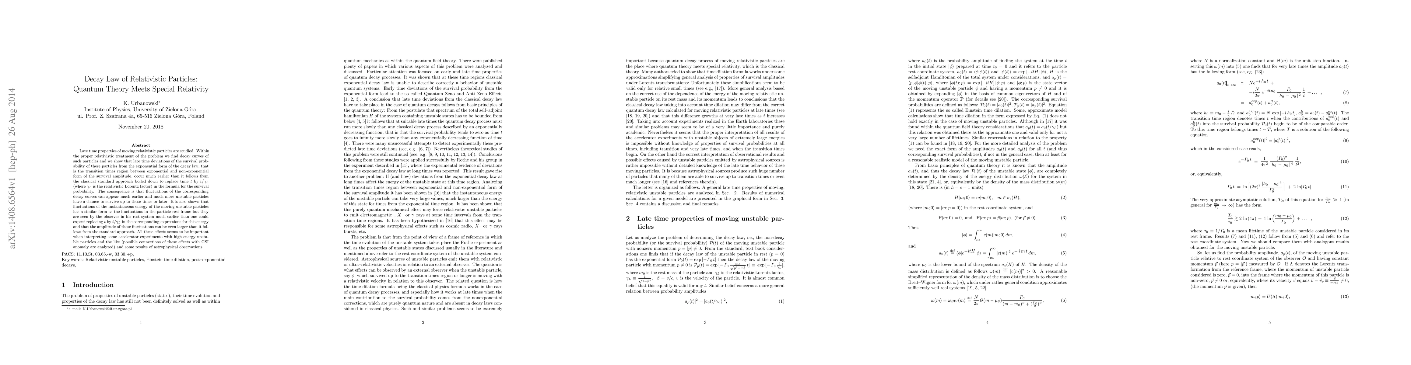 Researchers study late-time properties of relativistic particles using quantum theory and special relativity, finding that fluctuations can occur much earlier than expected, leading to unstable particles having a chance to survive longer.