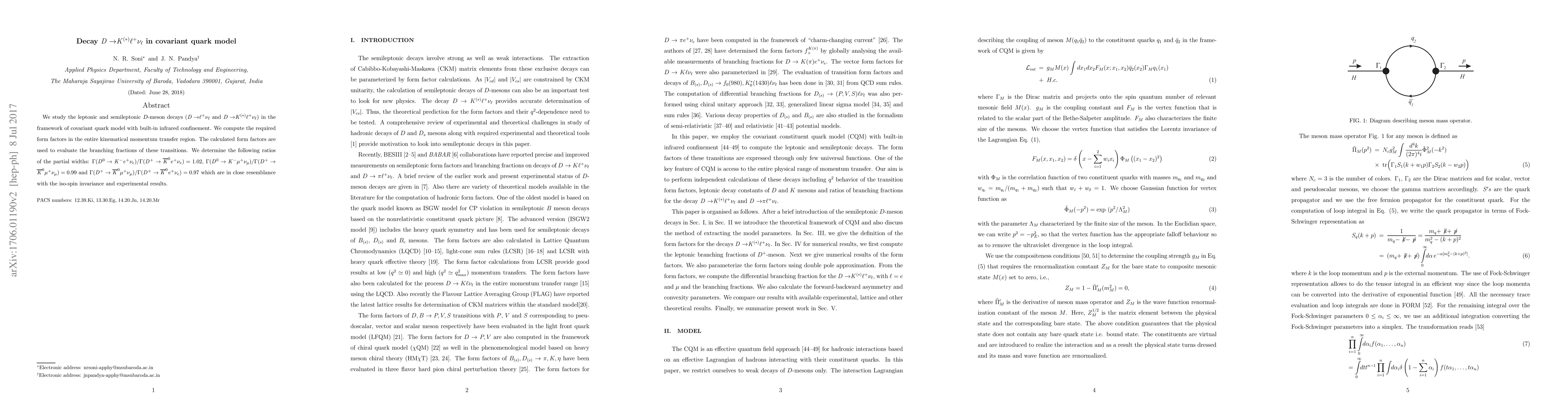This paper investigates $D$-meson decays using the covariant quark model, calculating form factors and branching fractions for leptonic and semileptonic processes. The study finds ratios of partial widths consistent with iso-spin invariance and experimental data.