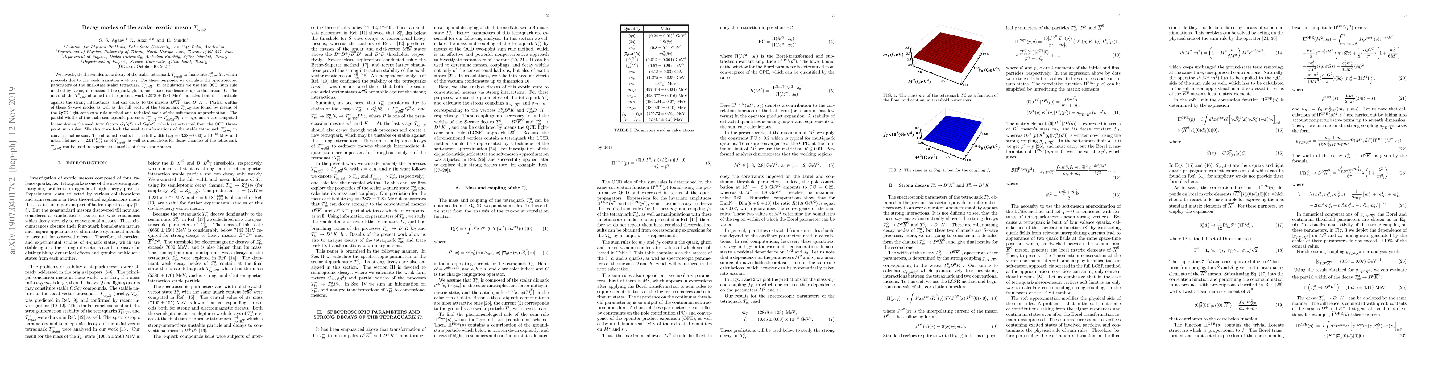 We investigate the semileptonic decay of the scalar tetraquark $T_{bs; \overline{u}\overline{d}}^{-}$ to final state $T_{cs;\overline{u}\overline{d} }^{0} l \overline{\nu}_l$, which proceeds due to the weak transition $b \to c l \overline{\nu}_l$. For these purposes, we calculate the spectroscopic parameters of the final-state scalar tetraquark $T_{cs;\overline{u}\overline{ d}}^{0}$. In calculations we use the QCD sum rule method by taking into account the quark, gluon, and mixed condensates up to dimension 10. The mass of the $T_{cs;\overline{u}\overline{d}}^{0}$ obtained in the present work $( 2878 \pm 128 )~\mathrm{MeV}$ indicates that it is unstable against the strong interactions, and can decay to the mesons $D^{0}\overline{K}^{0}$ and $D^{+}K^{-}$. Partial widths of these $S$-wave modes as well as the full width of the tetraquark $T_{cs;\overline{u}\overline{d}}^{0}$ are found by means of the QCD light-cone sum rule method and technical tools of the soft-meson approximation. The partial widths of the main semileptonic processes $T_{bs;\overline{u}\overline{d}}^{-} \to T_{cs;\overline{u} \overline{d}}^{0}l\overline{\nu}_l$, $l=e, \mu$, and $\tau$ are computed by employing the weak form factors $G_{1}(q^2)$ and $G_{2}(q^2)$, which are extracted from the QCD three-point sum rules. We also trace back the weak transformations of the stable tetraquark $T_{bb;\overline{u}\overline{d} }^{-} $ to conventional mesons. The obtained results for the full width $ \Gamma_{\mathrm{full}}=(3.28\pm 0.60) \times 10^{-10}~\mathrm{MeV} $ and mean lifetime $\tau=2.01_{-0.31}^{+0.44}~\mathrm{ps}$ of $T_{bs;\overline{u} \overline{d}}^{-}$, as well as predictions for decay channels of the tetraquark $T_{bb;\overline{u}\overline{d}}^{-}$ can be used in experimental studies of these exotic states. \end{abstract}