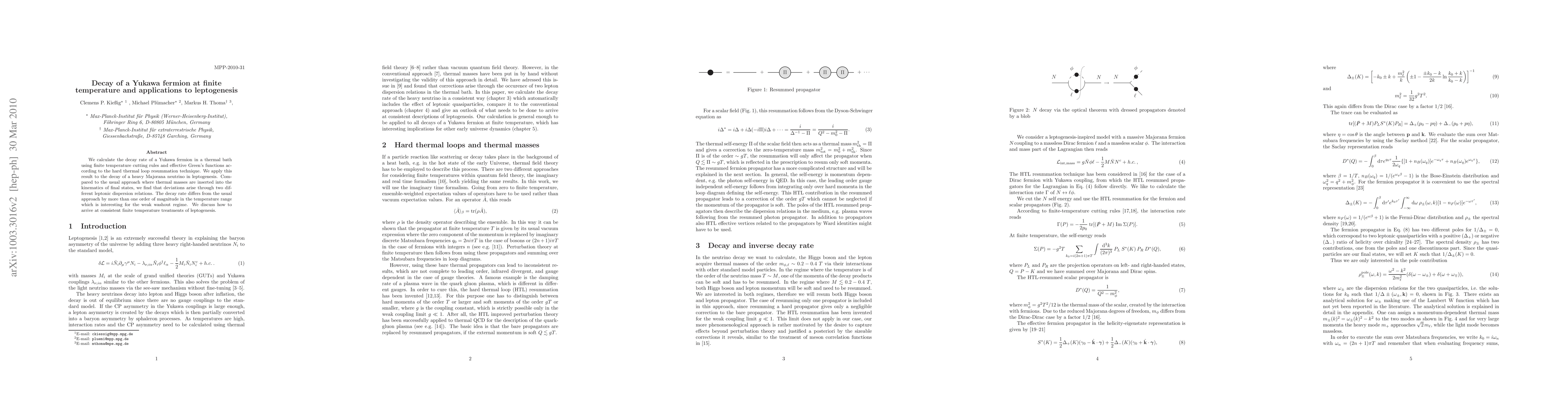 We calculate the decay rate of a Yukawa fermion in a thermal bath using finite temperature cutting rules and effective Green's functions according to the hard thermal loop resummation technique. We apply this result to the decay of a heavy Majorana neutrino in leptogenesis. Compared to the usual approach where thermal masses are inserted into the kinematics of final states, we find that deviations arise through two different leptonic dispersion relations. The decay rate differs from the usual approach by more than one order of magnitude in the temperature range which is interesting for the weak washout regime. We discuss how to arrive at consistent finite temperature treatments of leptogenesis.