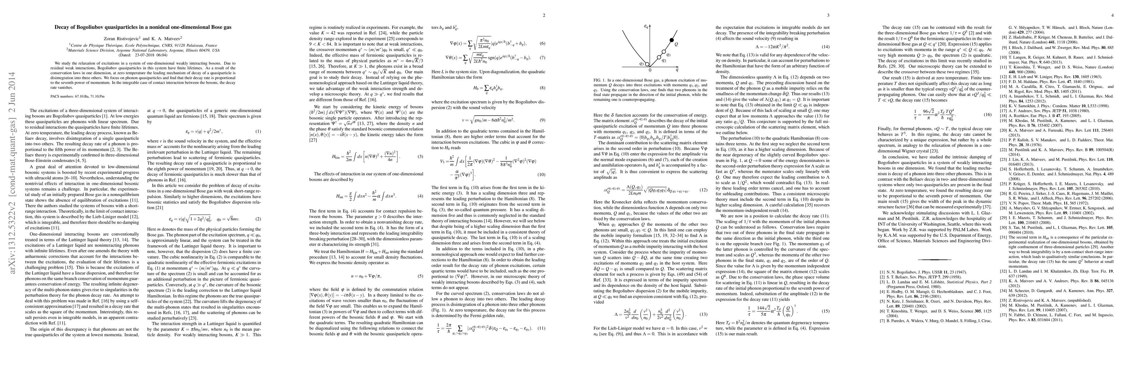 This paper investigates the decay of Bogoliubov quasiparticles in a nonideal one-dimensional Bose gas, revealing that phonon quasiparticles disintegrate into three others due to weak interactions, with a decay rate proportional to the seventh power of momentum. In the integrable case of contact interaction, the decay rate is zero.