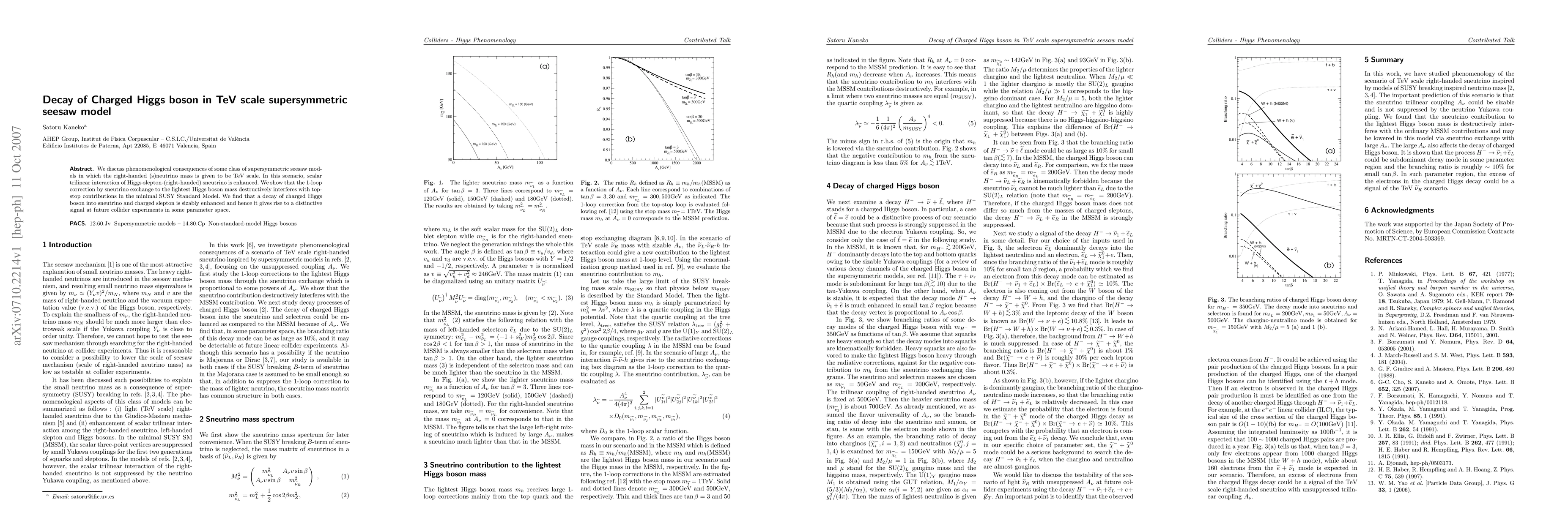 We discuss phenomenological consequences of some class of supersymmetric seesaw models in which the right-handed (s)neutrino mass is given to be TeV scale. In this scenario, scalar trilinear interaction of Higgs-slepton-(right-handed) sneutrino is enhanced. We show that the 1-loop correction by sneutrino exchange to the lightest Higgs boson mass destructively interferes with top-stop contributions in the minimal SUSY Standard Model. We find that a decay of charged Higgs boson into sneutrino and charged slepton is sizably enhanced and hence it gives rise to a distinctive signal at future collider experiments in some parameter space.