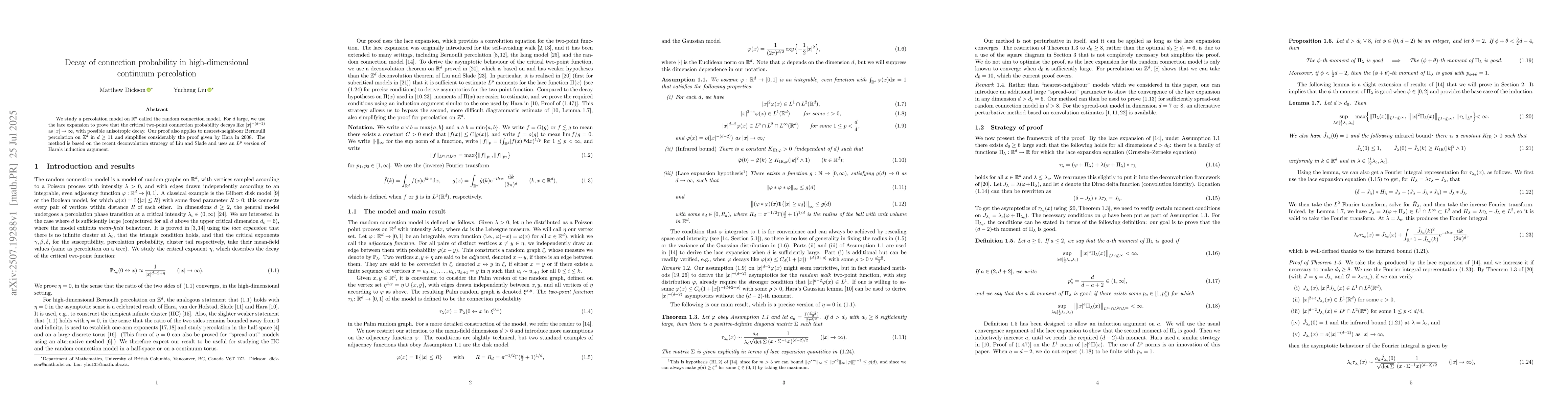 We study a percolation model on $\mathbb R^d$ called the random connection model. For $d$ large, we use the lace expansion to prove that the critical two-point connection probability decays like $|x|^{-(d-2)}$ as $|x| \to \infty$, with possible anisotropic decay. Our proof also applies to nearest-neighbour Bernoulli percolation on $\mathbb Z^d$ in $d \ge 11$ and simplifies considerably the proof given by Hara in 2008. The method is based on the recent deconvolution strategy of Liu and Slade and uses an $L^p$ version of Hara's induction argument.