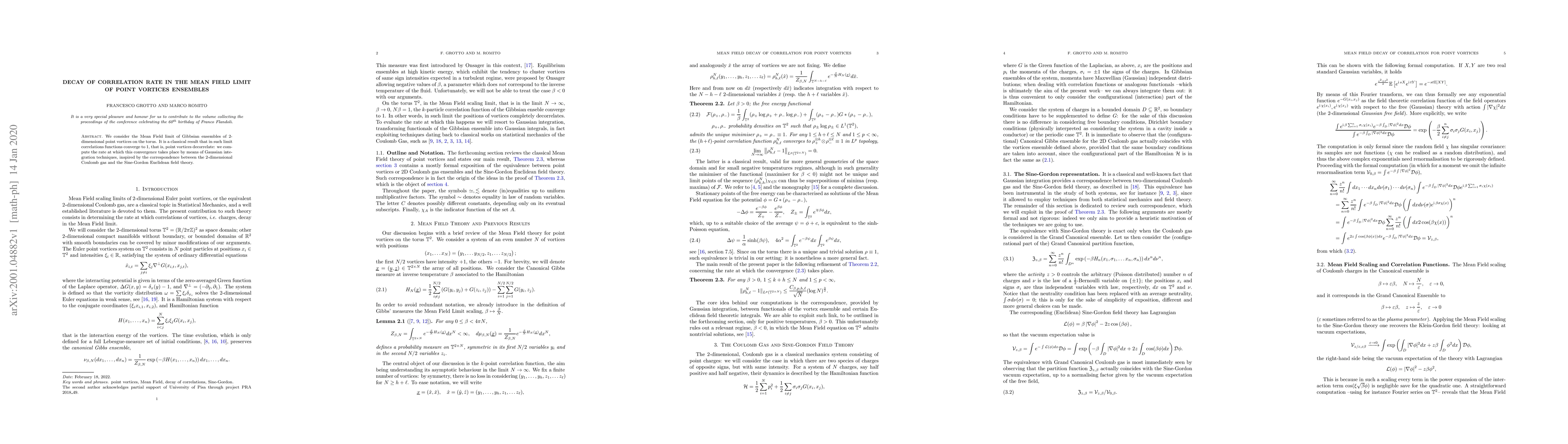 We consider the Mean Field limit of Gibbsian ensembles of 2-dimensional point vortices on the torus. It is a classical result that in such limit correlations functions converge to 1, that is, point vortices decorrelate: we compute the rate at which this convergence takes place by means of Gaussian integration techniques, inspired by the correspondence between the 2-dimensional Coulomb gas and the Sine-Gordon Euclidean field theory.