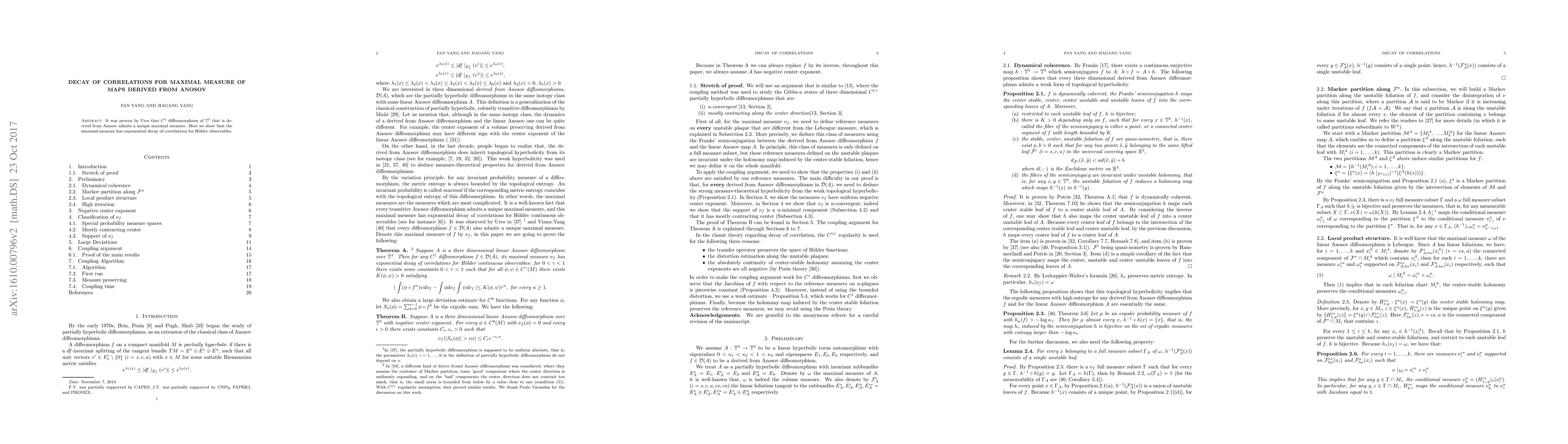 This research paper shows that for Anosov maps on a 3D torus, a unique maximal measure exists with exponential decay of correlations for certain observables when the middle eigenvalue is contracting.