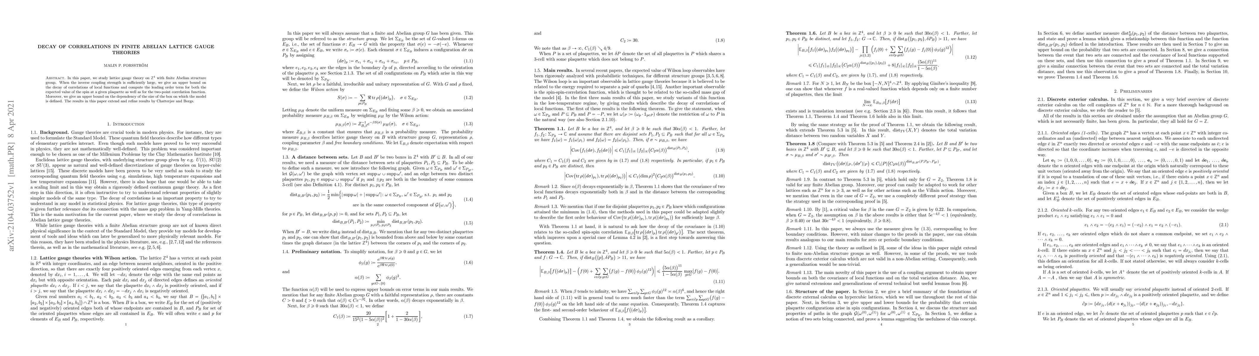In this paper, we study lattice gauge theory on \( \mathbb{Z}^4 \) with finite Abelian structure group. When the inverse coupling strength is sufficiently large, we give an upper bound on the decay of correlations of local functions and compute the leading order term for both the expected value of the spin at a given plaquette as well as for the two-point correlation function. Moreover, we give an upper bound on the dependency of the size of the box on which the model is defined. The results in this paper extend and refine results by Chatterjee and Borgs.