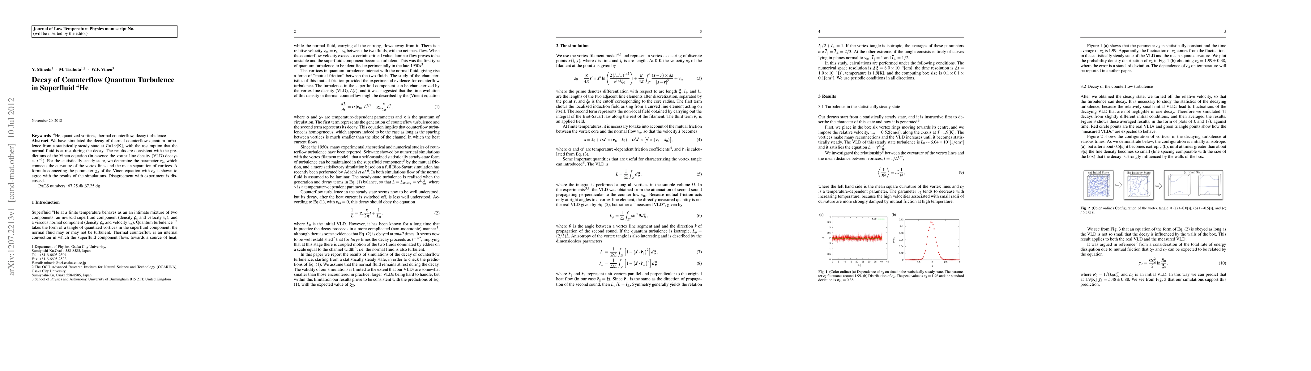 Researchers simulated the decay of thermal counterflow quantum turbulence in superfluid He-4, finding consistent results with Vinen equation predictions and a new formula connecting parameter c_2 to ς_2.