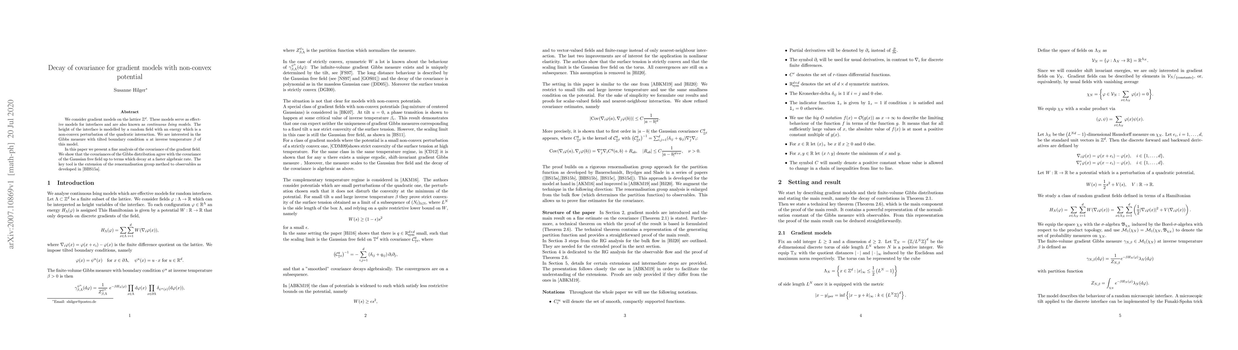 This paper analyzes gradient models on the lattice with non-convex potentials, showing that the covariance of the Gibbs measure decays at a faster algebraic rate compared to the Gaussian free field. The study employs an extended renormalisation group method to achieve this fine analysis.