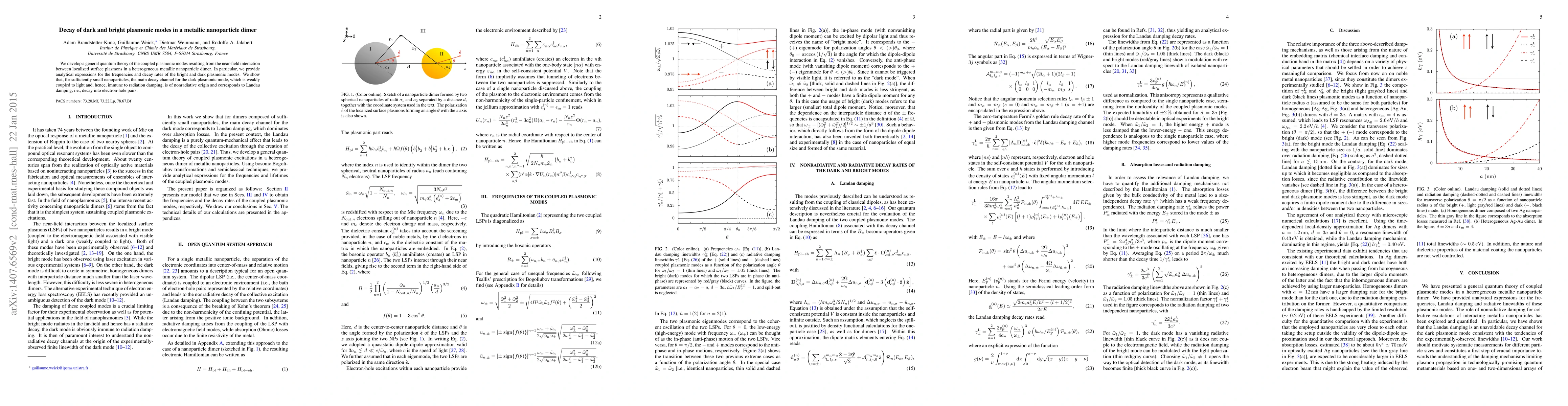 We develop a general quantum theory of the coupled plasmonic modes resulting from the near-field interaction between localized surface plasmons in a heterogeneous metallic nanoparticle dimer. In particular, we provide analytical expressions for the frequencies and decay rates of the bright and dark plasmonic modes. We show that, for sufficiently small nanoparticles, the main decay channel for the dark plasmonic mode, which is weakly coupled to light and, hence, immune to radiation damping, is of nonradiative origin and corresponds to Landau damping, i.e., decay into electron-hole pairs.