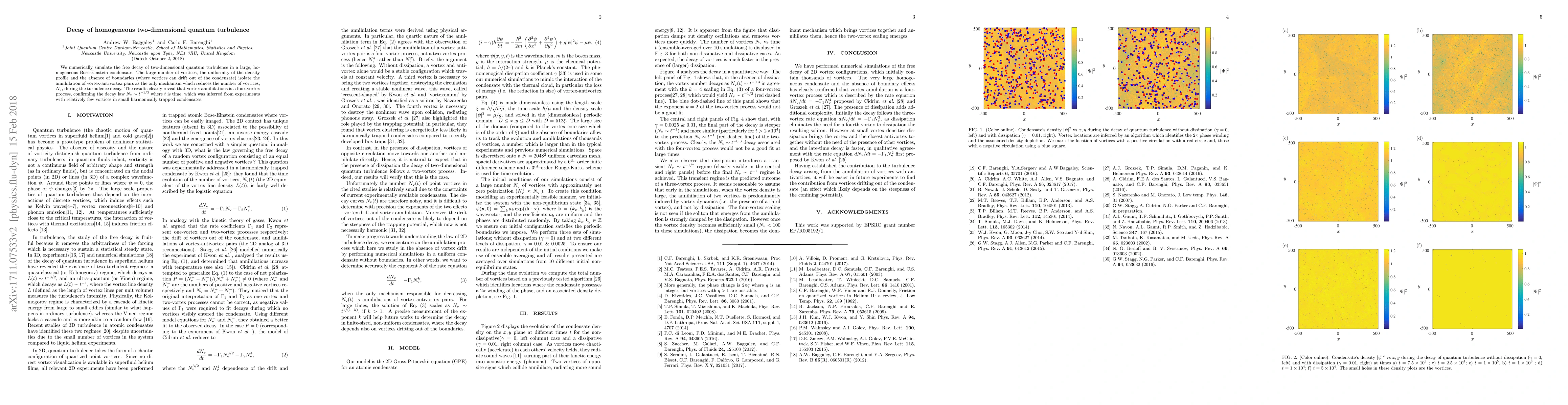 This paper numerically simulates the decay of two-dimensional quantum turbulence in a homogeneous Bose-Einstein condensate, finding that vortex annihilation is a four-vortex process. The study confirms the decay law $\Nv \sim t^{-1/3}$, previously inferred from experiments with fewer vortices.