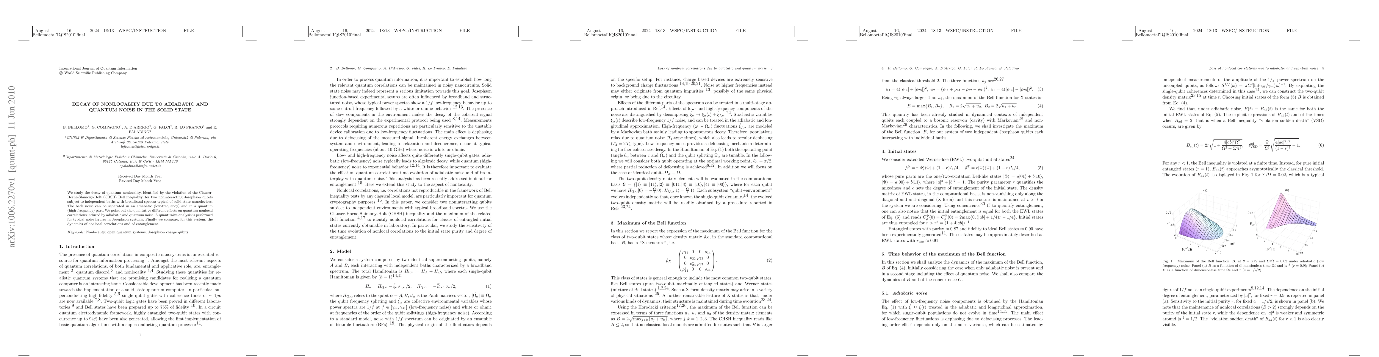 This paper investigates the decay of quantum nonlocality in Josephson qubits influenced by adiabatic and quantum noise, showing distinct effects on nonlocal correlations. It provides a quantitative analysis of typical noise figures in Josephson systems and compares the dynamics of nonlocal correlations and entanglement.