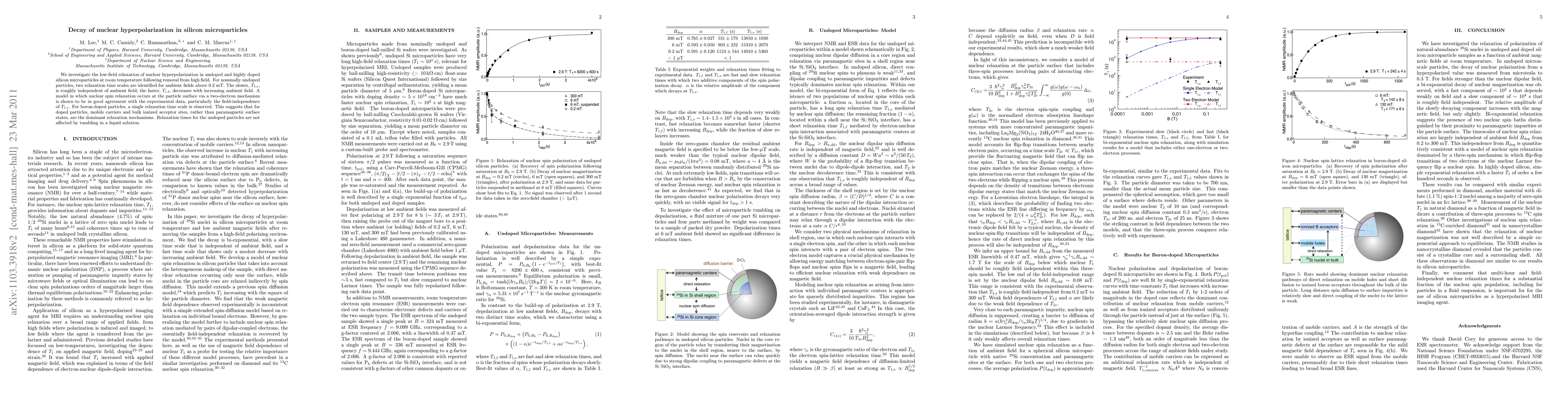 This study examines the relaxation of nuclear hyperpolarization in silicon microparticles, identifying two distinct relaxation time scales for undoped particles and one for boron-doped particles. The slower relaxation in undoped particles is field-independent, suggesting surface-mediated two-electron mechanisms, while doped particles exhibit relaxation dominated by mobile carriers and bulk ionized acceptors.