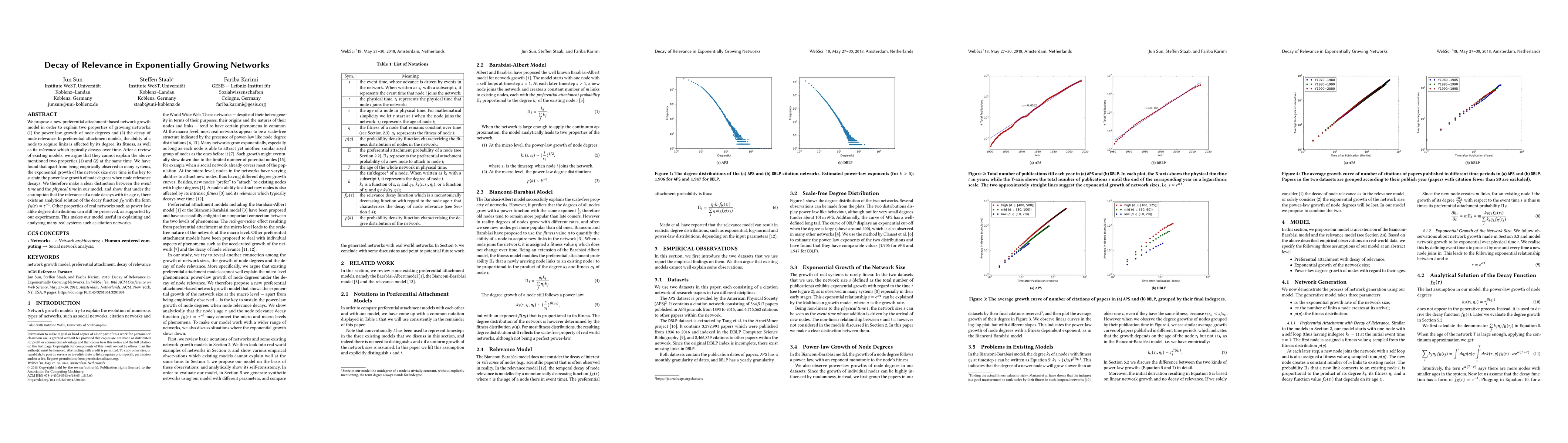 We propose a new preferential attachment-based network growth model in order to explain two properties of growing networks: (1) the power-law growth of node degrees and (2) the decay of node relevance. In preferential attachment models, the ability of a node to acquire links is affected by its degree, its fitness, as well as its relevance which typically decays over time. After a review of existing models, we argue that they cannot explain the above-mentioned two properties (1) and (2) at the same time. We have found that apart from being empirically observed in many systems, the exponential growth of the network size over time is the key to sustain the power-law growth of node degrees when node relevance decays. We therefore make a clear distinction between the event time and the physical time in our model, and show that under the assumption that the relevance of a node decays with its age $\tau$, there exists an analytical solution of the decay function $f_R$ with the form $f_R(\tau) = \tau^{-1}$. Other properties of real networks such as power-law alike degree distributions can still be preserved, as supported by our experiments. This makes our model useful in explaining and analysing many real systems such as citation networks.