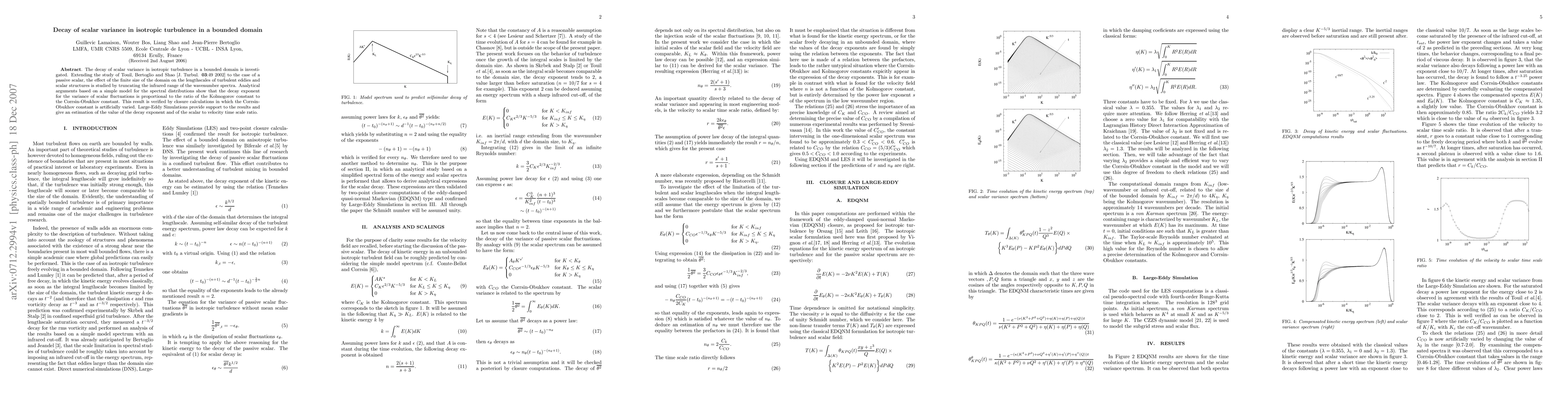 This paper investigates the decay of scalar variance in isotropic turbulence within a bounded domain, extending previous studies to passive scalars. Analytical and computational results show that the decay exponent is proportional to the ratio of the Kolmogorov constant to the Corrsin-Obukhov constant, supported by large-eddy simulations.