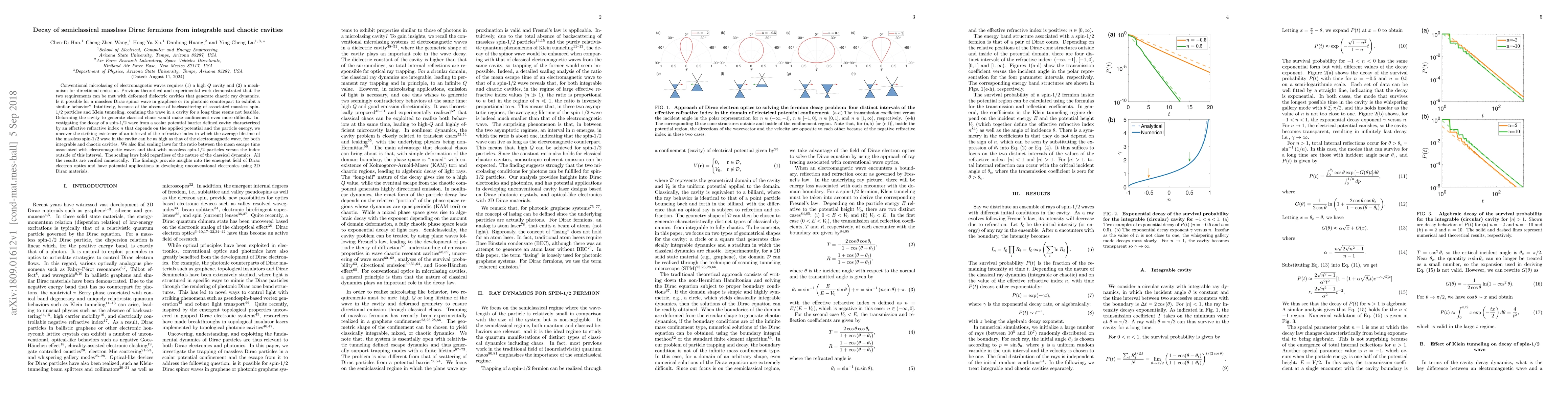 Conventional microlasing of electromagnetic waves requires (1) a high $Q$ cavity and (2) a mechanism for directional emission. Previous theoretical and experimental work demonstrated that the two requirements can be met with deformed dielectric cavities that generate chaotic ray dynamics. Is it possible for a massless Dirac spinor wave in graphene or its photonic counterpart to exhibit a similar behavior? Intuitively, because of the absence of backscattering of associated massless spin-1/2 particles and Klein tunneling, confining the wave in a cavity for a long time seems not feasible. Deforming the cavity to generate classical chaos would make confinement even more difficult. Investigating the decay of a spin-1/2 wave from a scalar potential barrier defined cavity characterized by an effective refractive index $n$ that depends on the applied potential and the particle energy, we uncover the striking existence of an interval of the refractive index in which the average lifetime of the massless spin-1/2 wave in the cavity can be as high as that of the electromagnetic wave, for both integrable and chaotic cavities. We also find scaling laws for the ratio between the mean escape time associated with electromagnetic waves and that with massless spin-1/2 particles versus the index outside of this interval. The scaling laws hold regardless of the nature of the classical dynamics. All the results are verified numerically. The findings provide insights into the emergent field of Dirac electron optics and have potential applications in developing unconventional electronics using 2D Dirac materials.