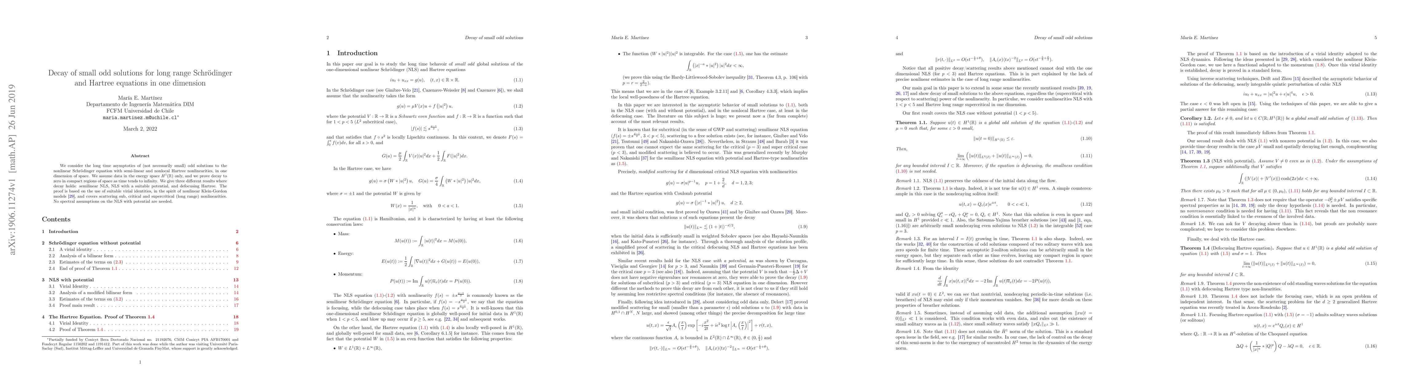 This paper studies the long-time behavior of odd solutions to one-dimensional nonlinear Schrödinger and Hartree equations, proving their decay to zero in compact spatial regions as time tends to infinity under various nonlinearities. The results apply to semilinear NLS, NLS with potential, and defocusing Hartree equations, leveraging virial identities.